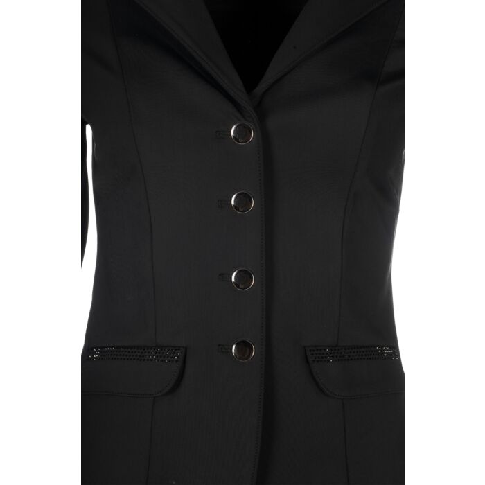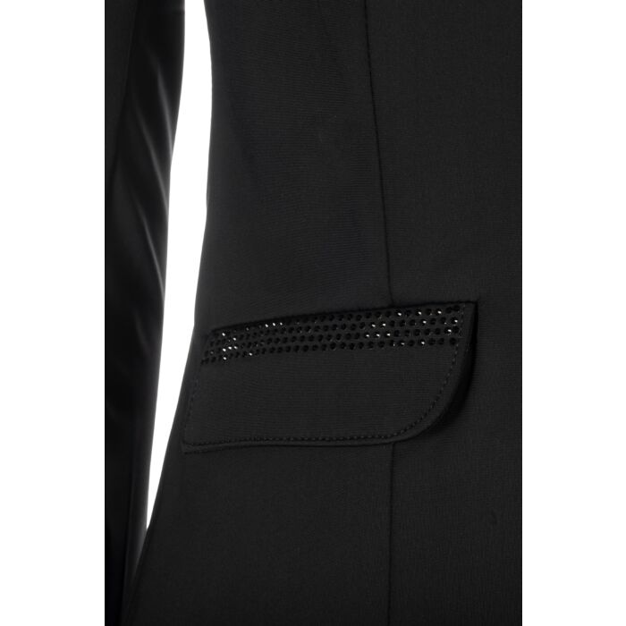 The competition jacket Amalfi by Lauria Garrelli combines exclusive elegance with functional features to meet the highest demands. The high-quality, crease-resistant material ensures a flawless look at all times, while the dirt-repellent surface makes the jacket particularly easy to care for. Fine rhinestones add stylish accents and give the design a sophisticated touch. The concealed zip behind the elegant button placket guarantees a perfect fit and a stylish look. Integrated riding slits allow maximum freedom of movement in the saddle, while two practical outer pockets offer additional comfort.