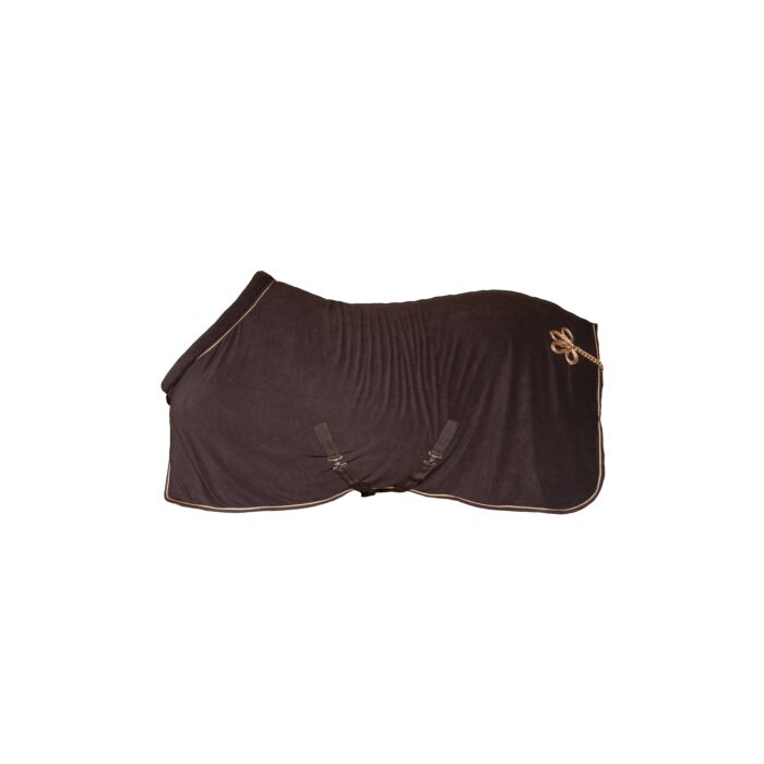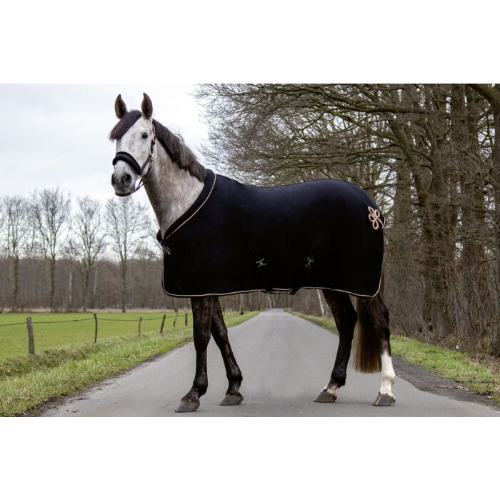 The cooler Rosegold Glamour Style combines maximum functionality with an elegant design and provides ideal support for the horse after training. The rug impresses with its breathable properties and optimum sweat absorption capacity, thus promoting the horse’s well-being. Thanks to the adjustable and removable cross surcingles with metal fasteners, the cooler can be easily adjusted to fit the horse. The tail strap also provides additional support so that the rug stays reliably in place even during intensive movements. The edge of the rug is finished with a decorative cord. Another highlight is the elegant rose gold detail at the back of the rug, which rounds off the luxurious design as an eye-catcher.
