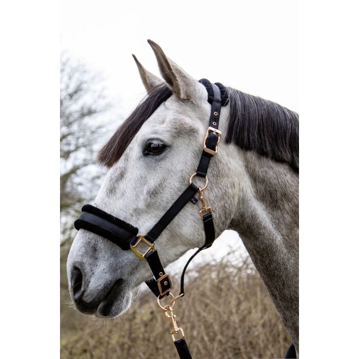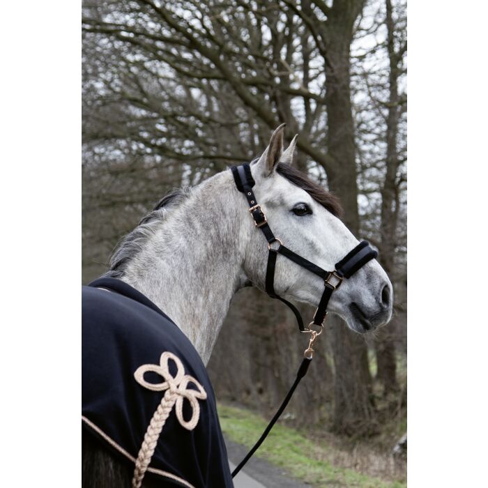 The headcollar Rosegold Glamour Style combines maximum comfort with elegant details. The softly lined noseband and browband make it pleasant to wear, while the synthetic lambskin offers additional protection and an elegant look. Thanks to the practical snap hook, the headcollar can be opened and closed effortlessly. The adjustable headpiece on both sides and the adjustable noseband ensure a perfect fit. The design is rounded off with sturdy, rose gold-coloured fittings, which create a particularly stylish look.