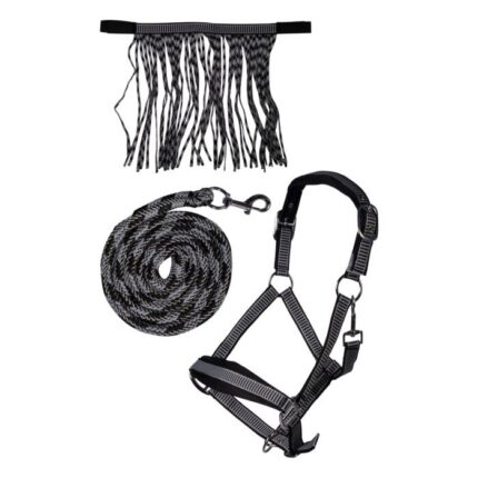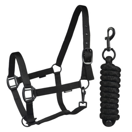 100% polypropylene with snap clip|browband and noseband have soft padding|strong silver coloured fittings 1.80 metres long