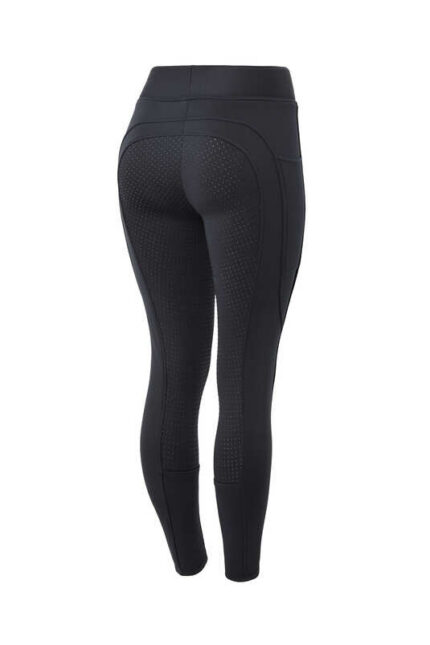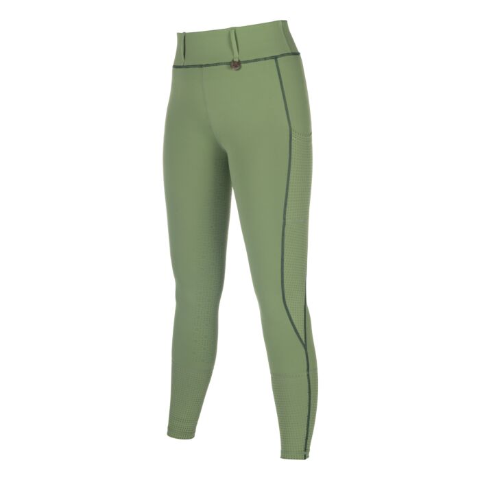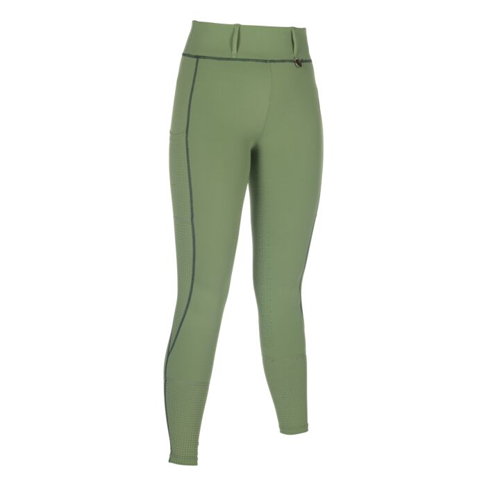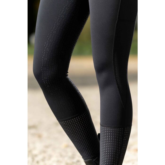 The riding leggings Juna with silicone full seat offer optimum support in the saddle and combine functionality with an elegant design. The breathable, bi-elastic material ensures a comfortable fit, while the laser-cut design inserts offer additional air permeability. Belt loops, a side mobile phone pocket and two side slit pockets make these leggings practical and suitable for everyday wear. The stylish overall look is rounded off with a high-quality metallic appliquรฉ.