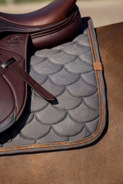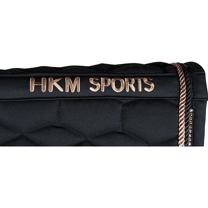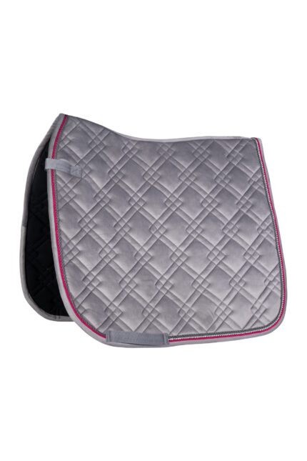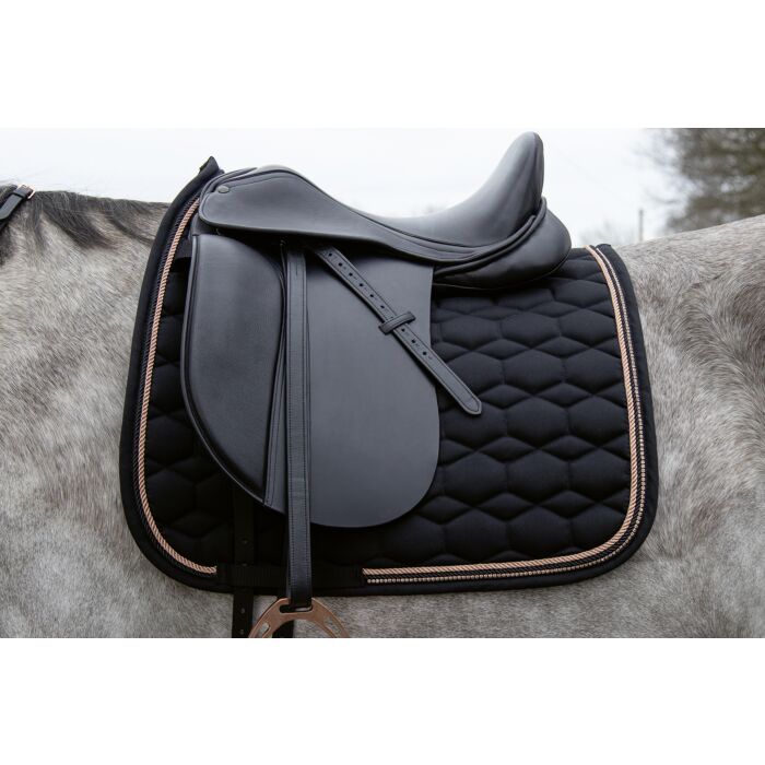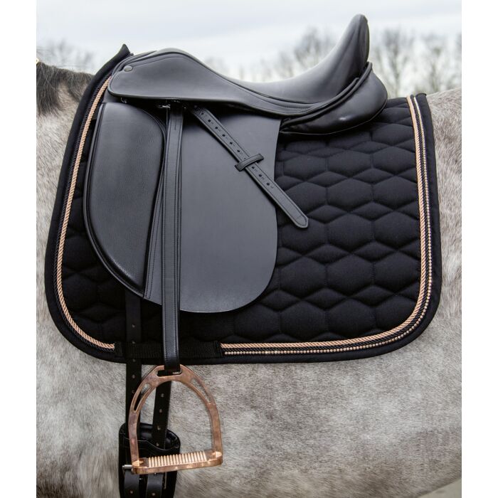 The saddle cloth Rosegold Glamour Style combines functionality with luxury. The underside is made of a functional knitted fabric that ensures rapid moisture transport so that the horse remains pleasantly dry even during intensive training sessions. Thanks to practical loops with Velcro fasteners, the saddle cloth can be put on securely and comfortably, while the foam and wadding filling guarantees soft padding and ideal pressure distribution. The edge of the saddle cloth features two fashionable decorative cords and a trim of sparkling rhinestones, while the fashionable quilting rounds off the design in style. A matching ear bonnet is available separately.