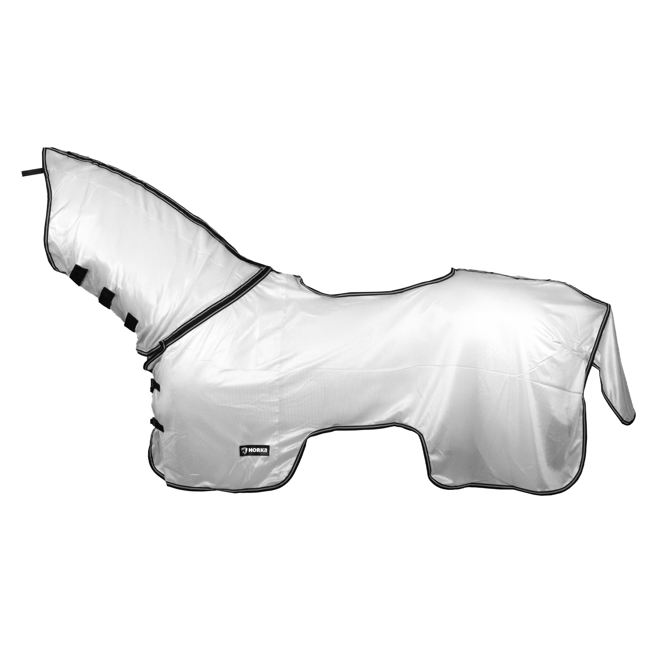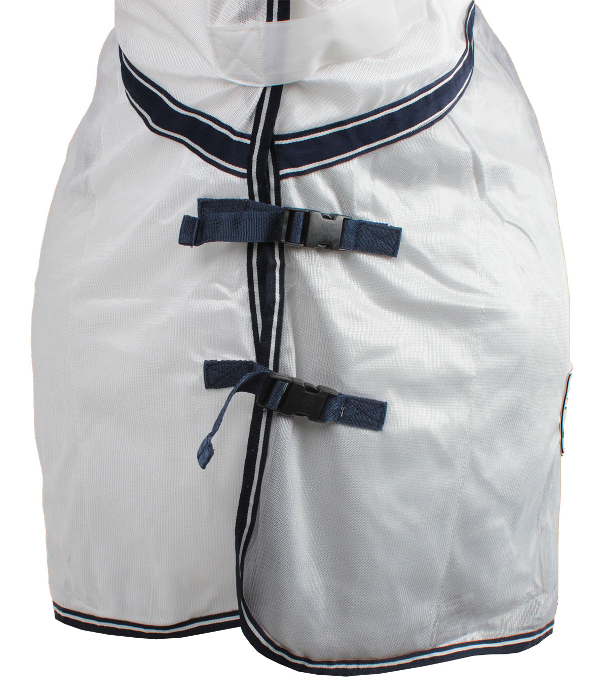 Anti-fly riding rug with a mesh neck in a zebra print. Product specifications: Neck and chest are equipped with plastic buckles; Nylon lining in the chest area; Tail flap: Chest; tail flap and neck area are nylon-lined to prevent chafing; Tail cord