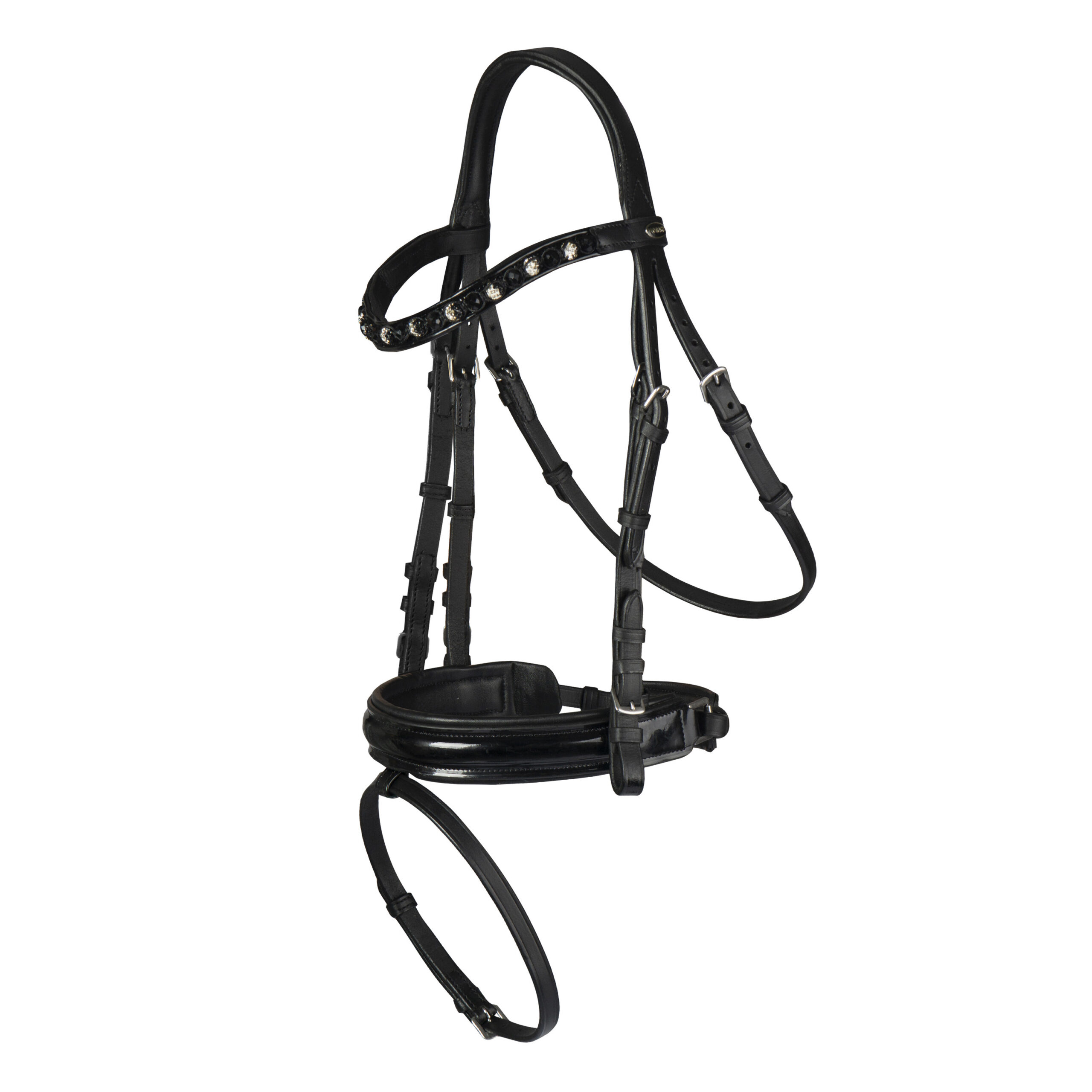 Bridle with Swedish patent leather noseband and flash strap. Product specifications: Browband features colored glass beads and crystals. Headpiece and noseband lined with soft sheepskin. Headpiece is a single piece. Includes web reins with stops.