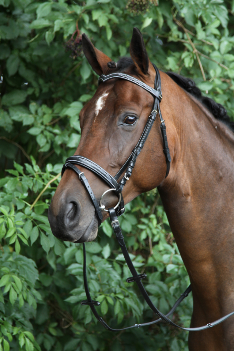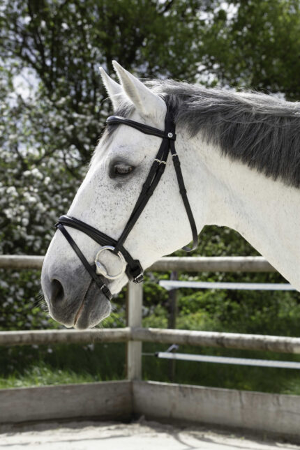The Verdi bridle features a beautiful V-shaped browband with white stitching. Product specifications: English noseband with flash strap. The noseband goes over the headpiece. Soft padding in the noseband and headpiece. Includes non-slip reins with stoppers.