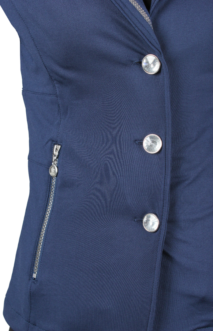 Competition jacket treated with polygiene to prevent the growth of odor-causing bacteria. The jacket is designed with a zipper below the buttons for a perfect fit