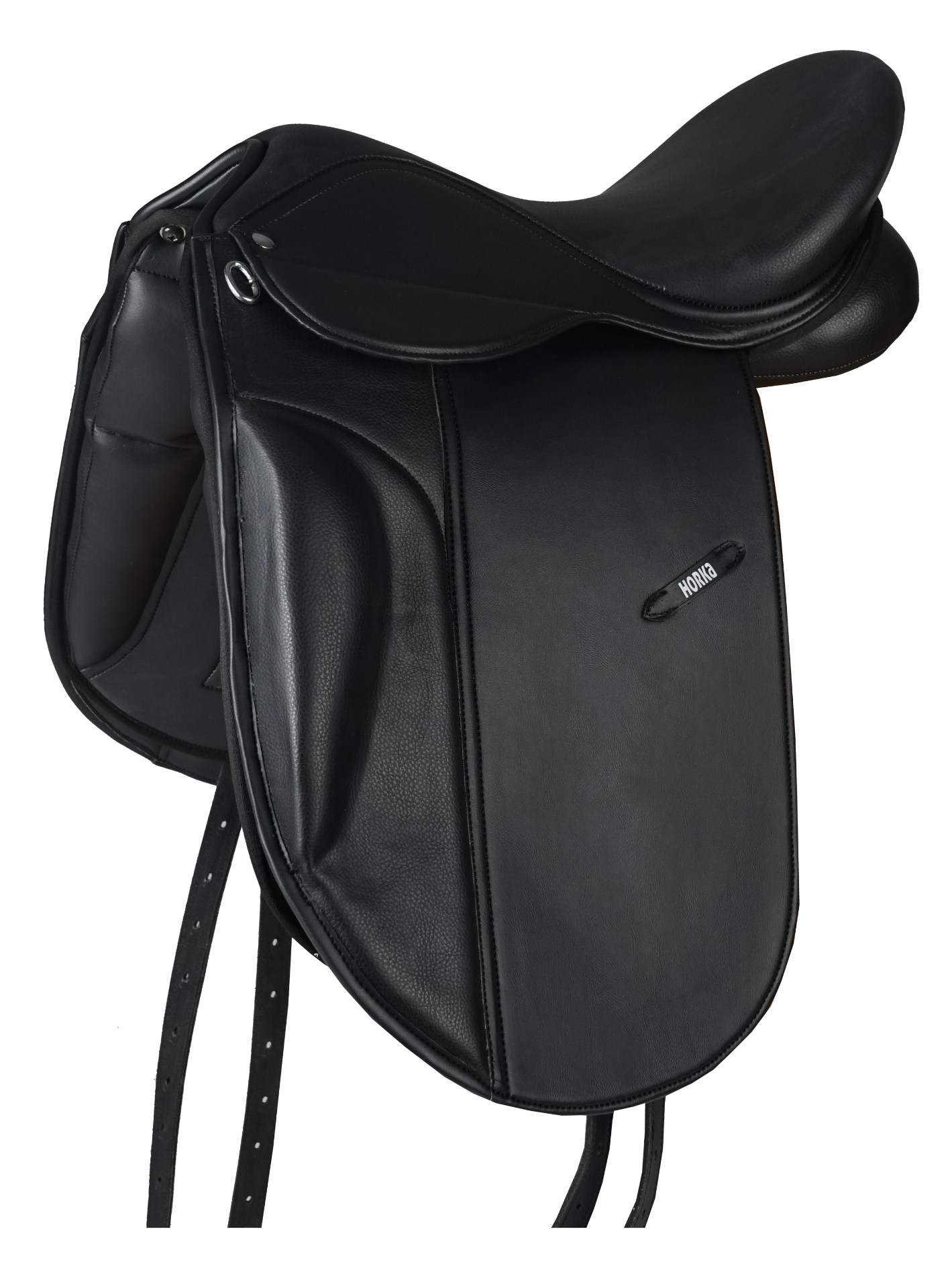 Dressage saddle made of synthetic leather finished with a suede look seat and knee roll for more grip and comfort. Product specifications: Flexible plastic/steel tree Interchangeable steel tree in various sizes (180042 Saddle Tree). The standard tree is medium black Filled with high-density PU foam: : Available in the seat sizes 16 inch 17 inch 18 inch Cushion length: 16 Inch: 45 cm 17 Inch: 48 cm 18 Inch: 50 cm