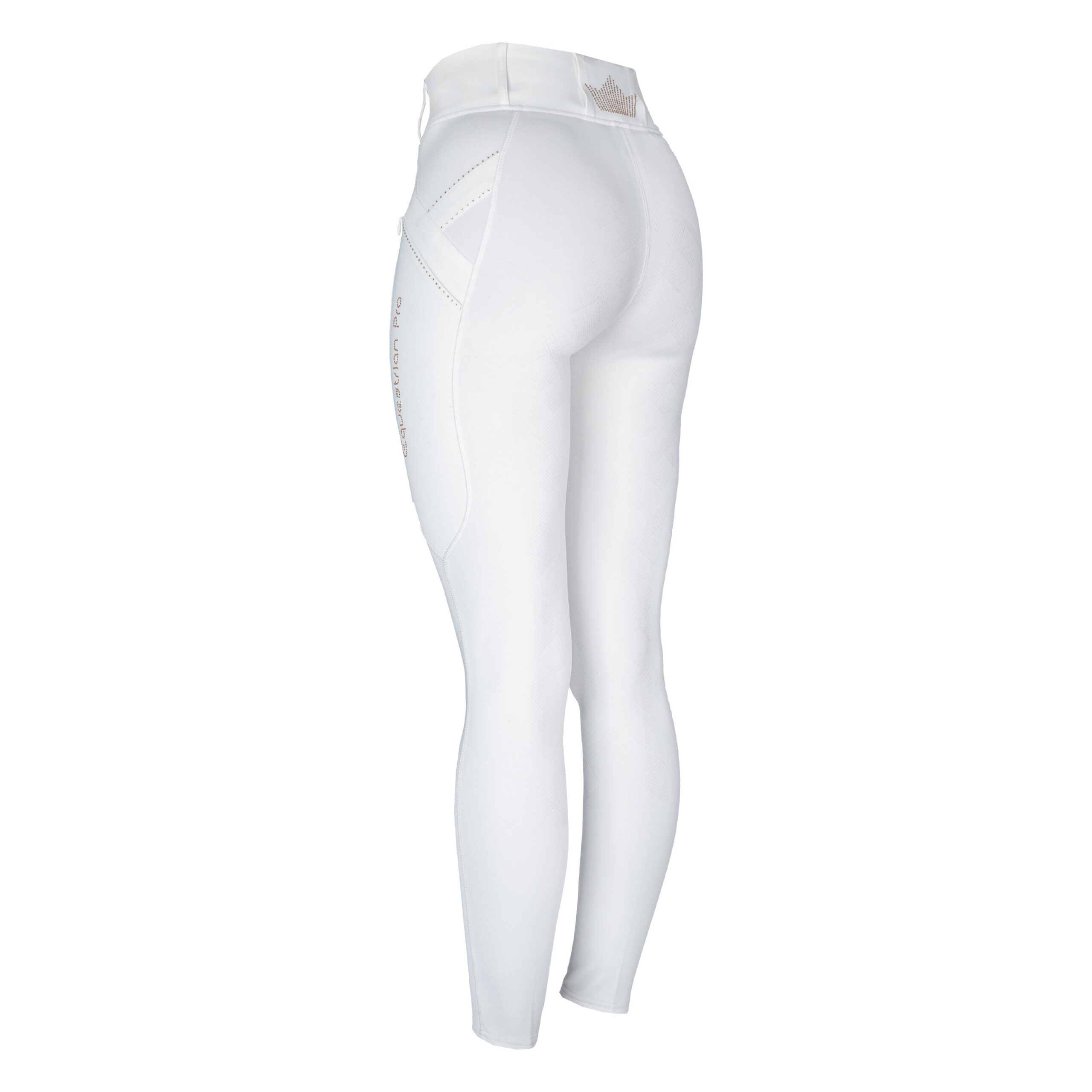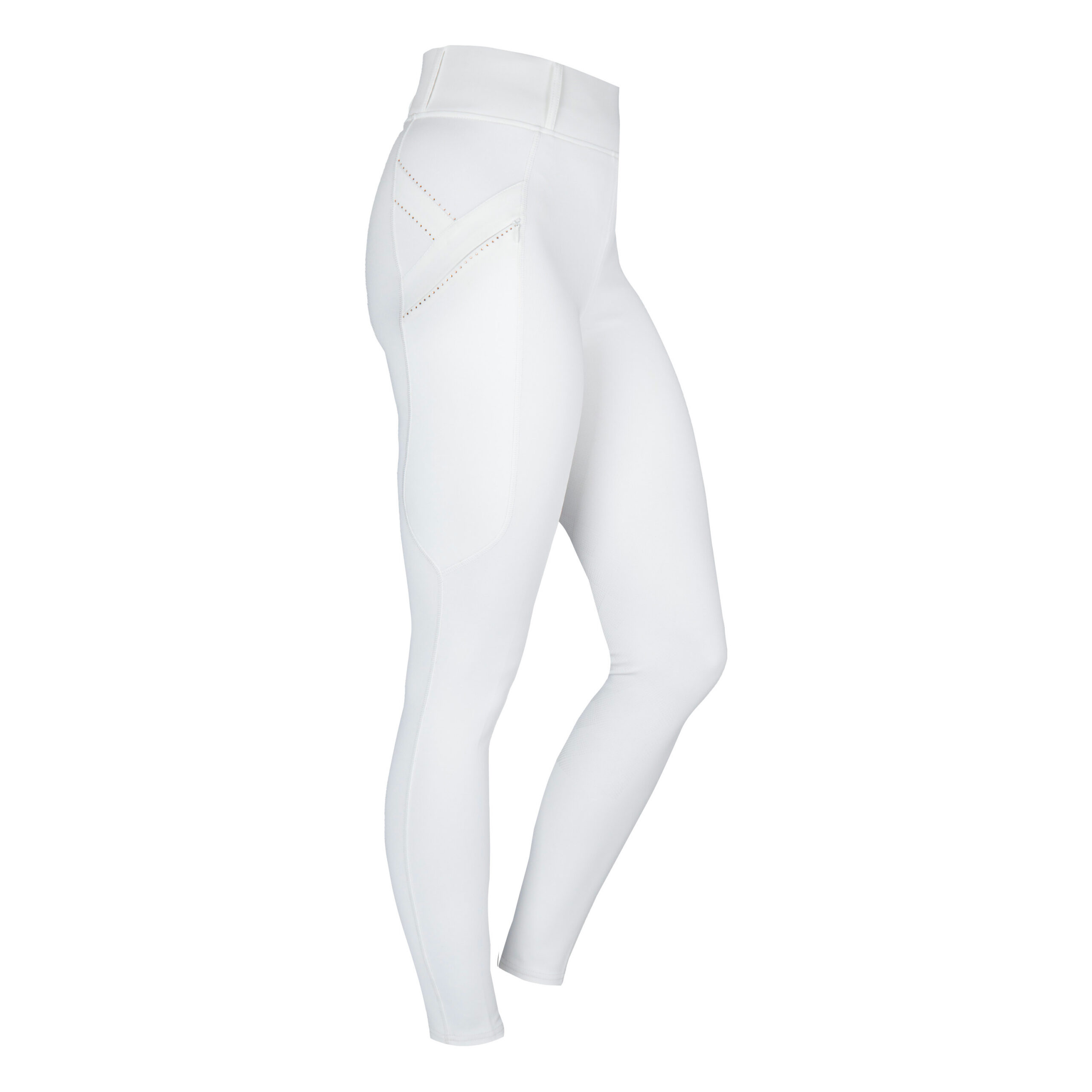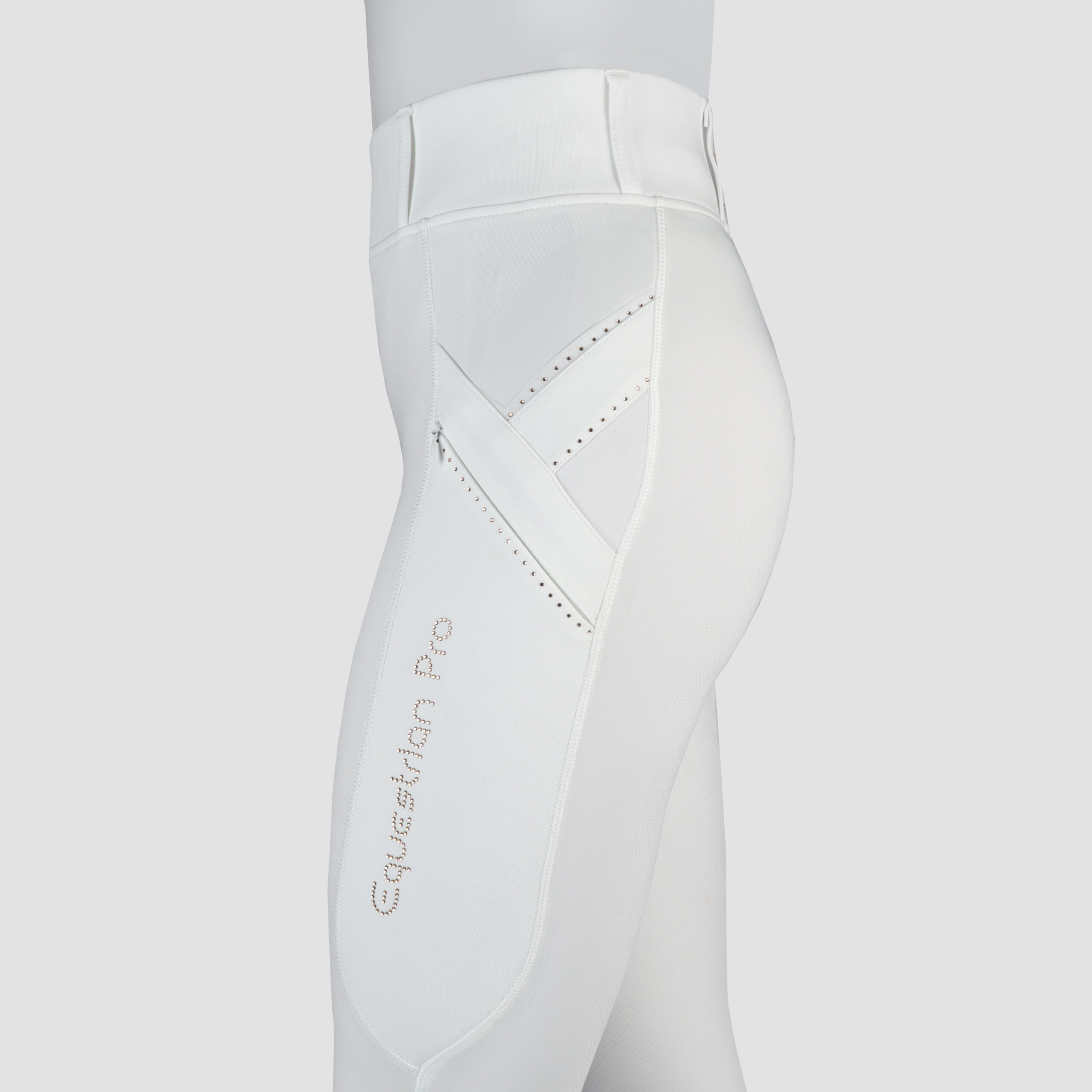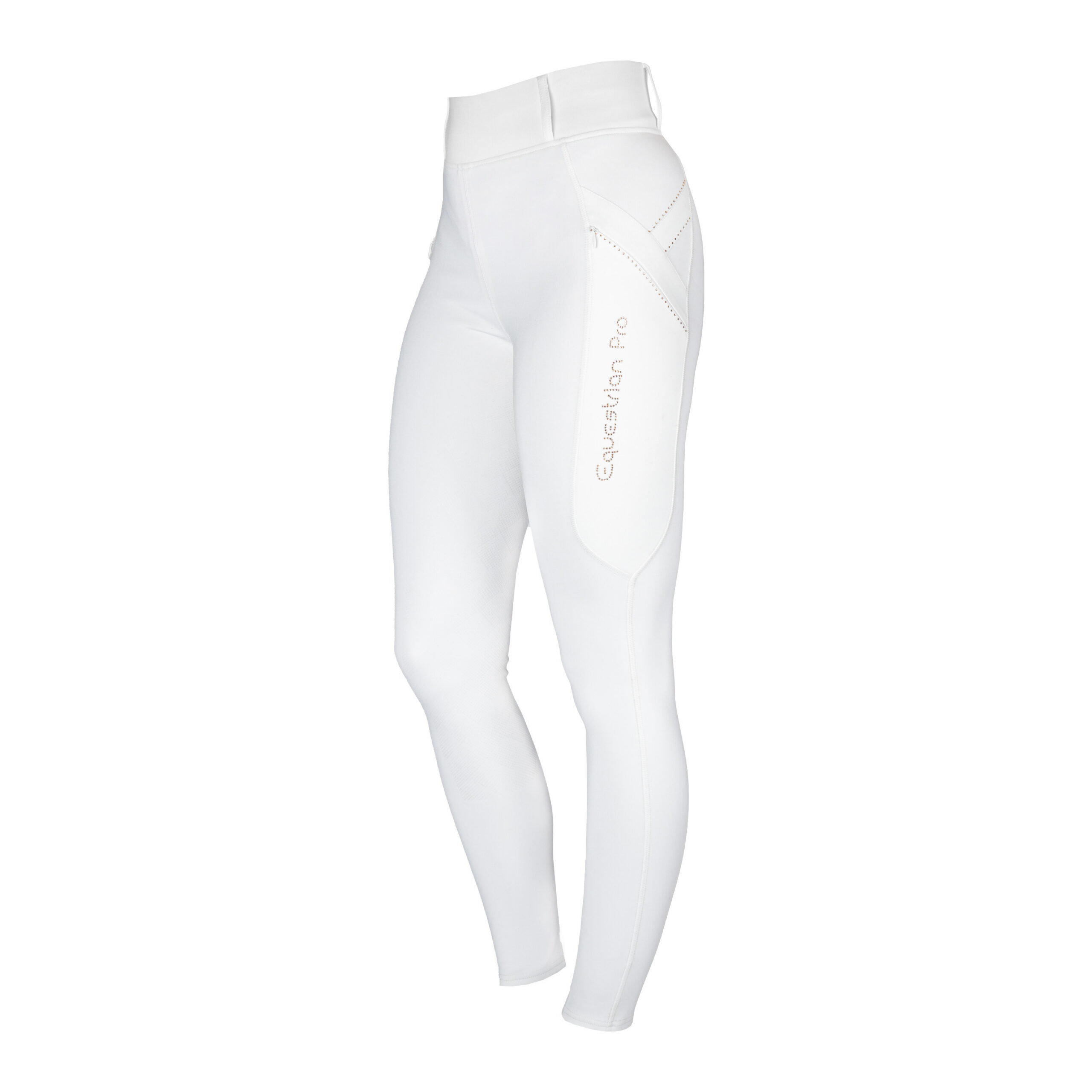 | A slightly fancier version of our bestselling riding tights. The Momentum combines a sportive, functional design with the chique and classy looks of bling. The same trusted comfortable feel and fit of our bestselling tights, the Momentum just has that added little “wow” factor through the addition of crystals on the piping around the side (phone) pockets, on the left thigh and on the back of the waistband. The printed silicone full seat ensures a good grip in the saddle and of course there is plenty of room for your mobile phone! Product Specifications: – Fancy pull up riding tights with flattering design and comfortable fit – High quality fabric with high abrasion resistance – Crystal accent piping, crystal artwork on thigh and back of waistband – Side mobile phone pocket with zipper – Light matte dot silicone full seat Material: 90% Polyester, 10% Spandex- knitted |