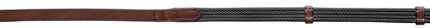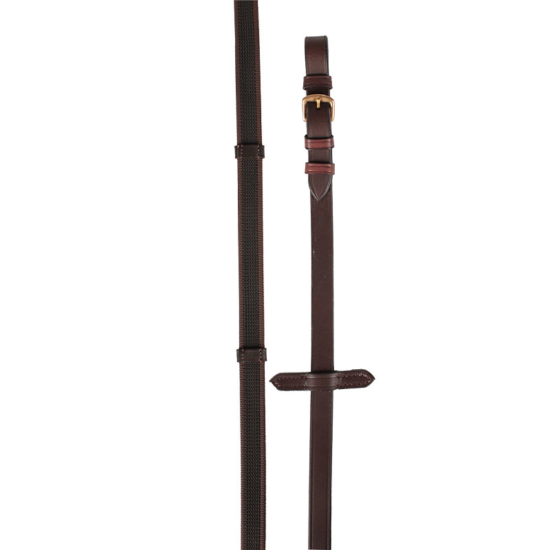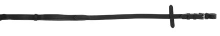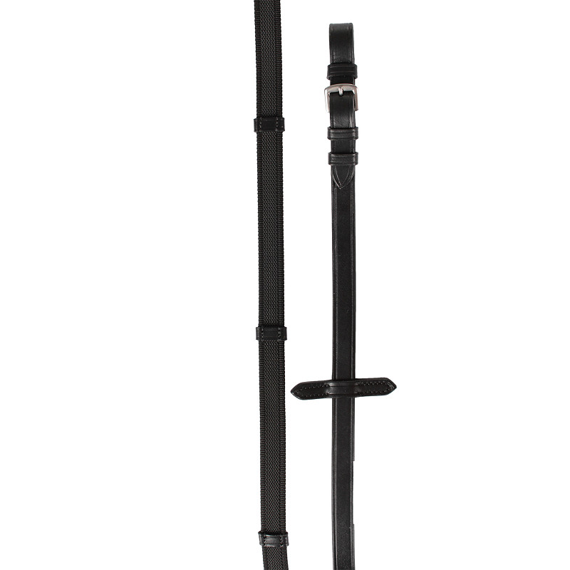 Anti slip reins made of webband with woven rubber and with stoppers.