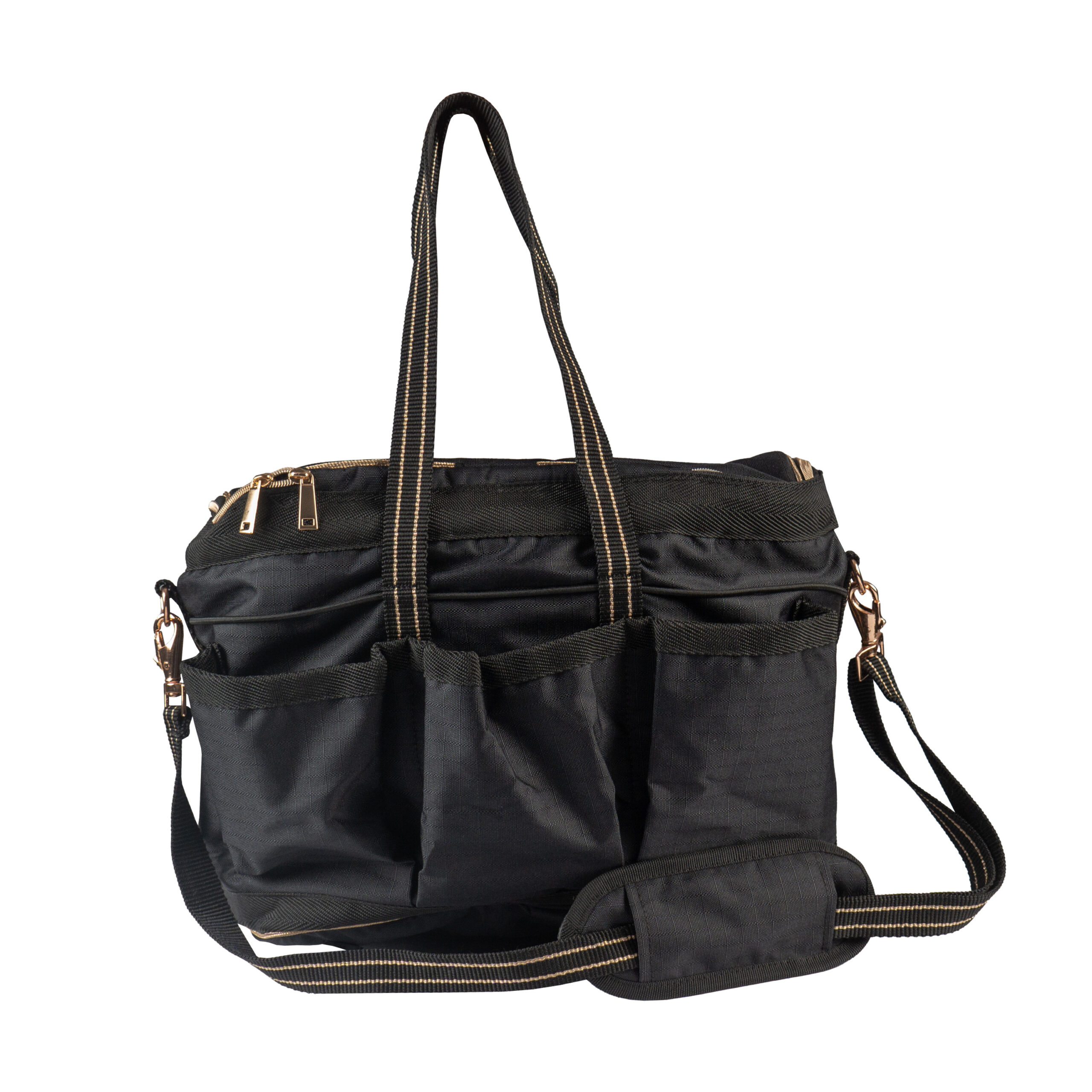 Luxury grooming bag with two sturdy handles, various stitch and zip pockets andย a top that can be closed with a zipper.