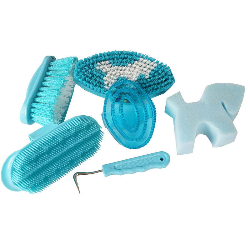 A fun grooming bag filled with a complete starter set of brushes. Contents: Hoof pick, sponge, curry brush, curry comb, long-bristled brush, and short-bristled brush. Dimensions: Length: 22 cm, Width: 10 cm, Height: 18 cm