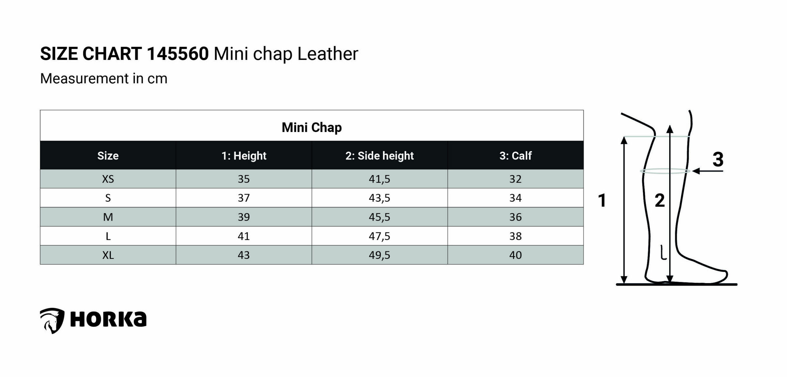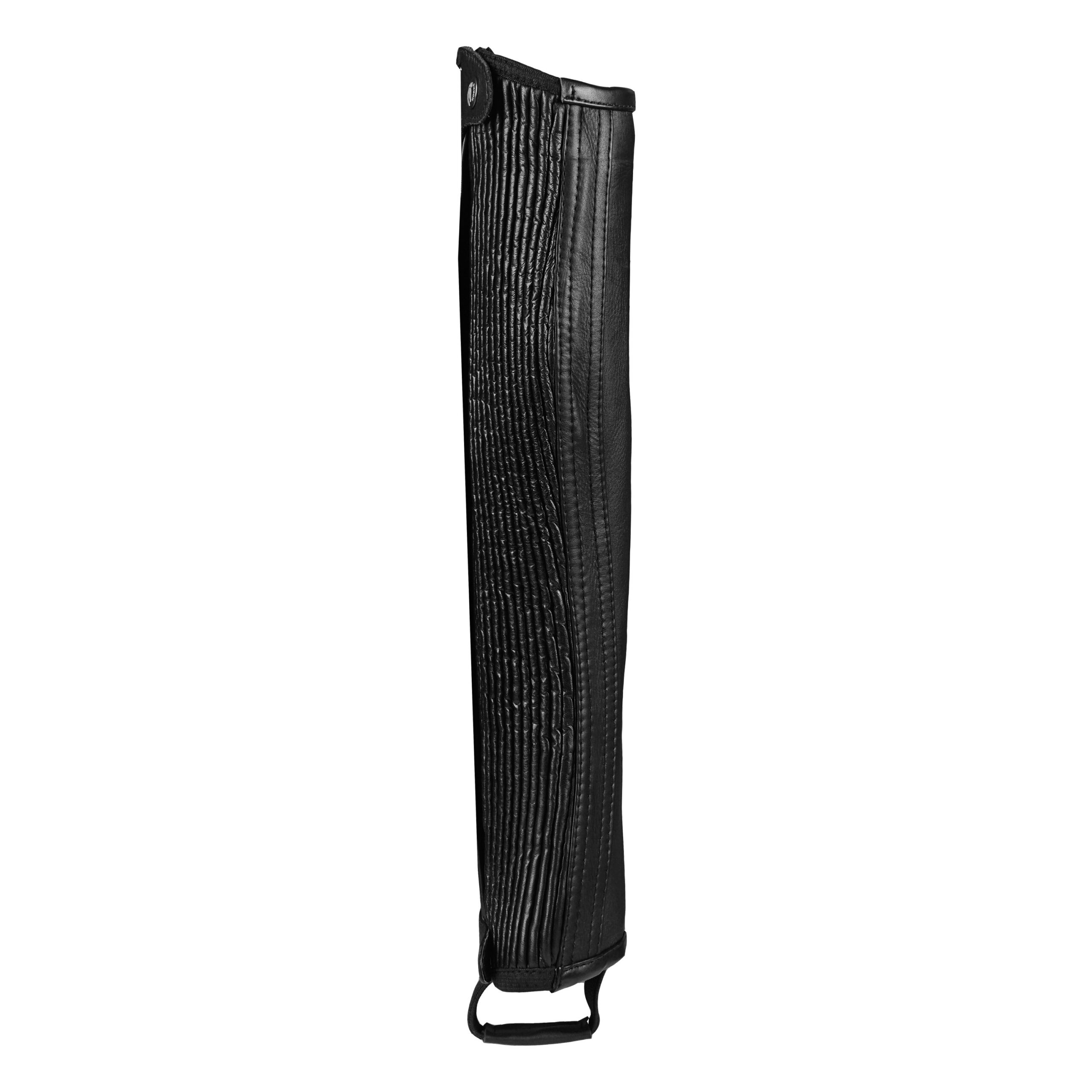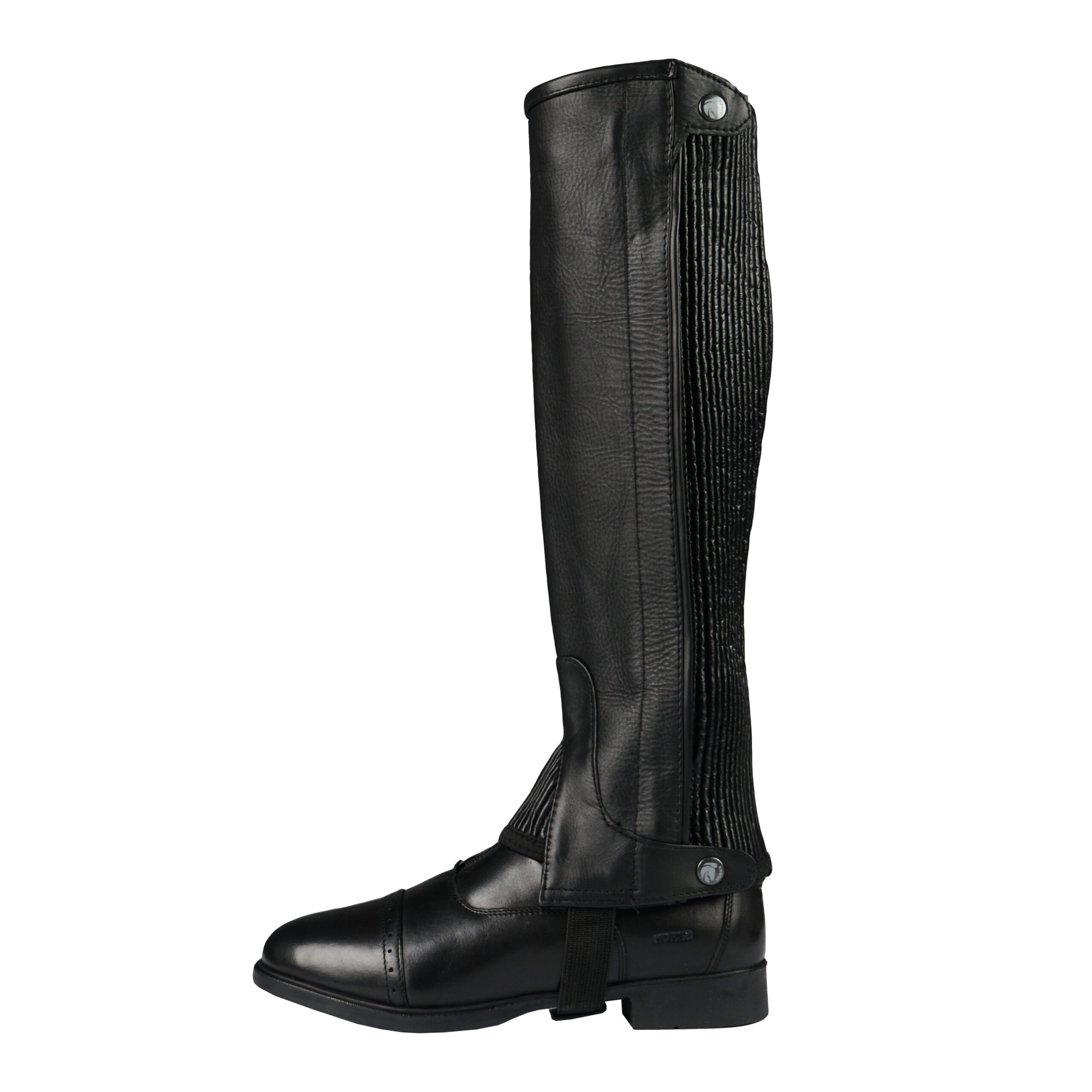 Basic chaps made of leather, with an elastic part on the calf and instep for a perfect fit. The zipper closes from top to bottom and has zipper protectors with press stud closure on top and bottom