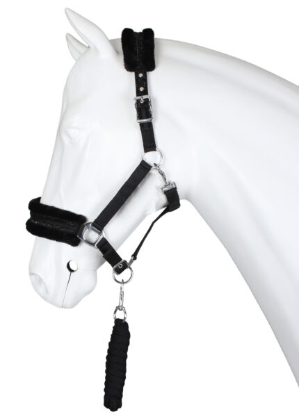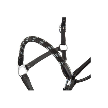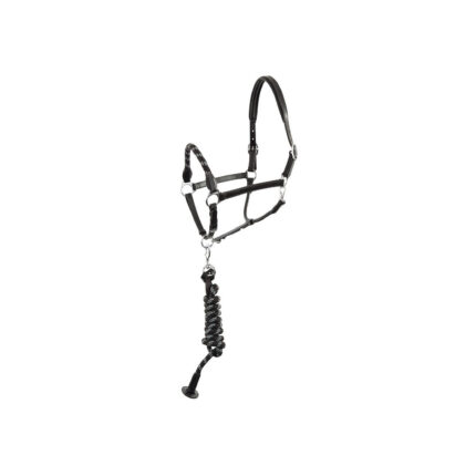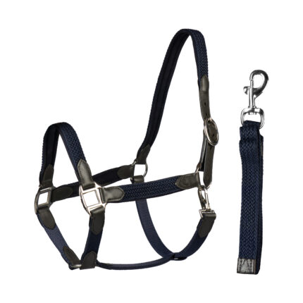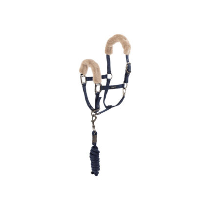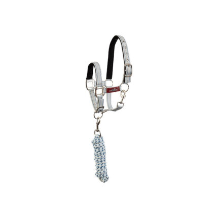 Materjal: PP-nailon ja polรผester Deluxe two tone halter set adjustable at both headpiece and noseband and comes with a 200 cm lead rope with snaphook. The halter is padded with a mesh liner at the headpiece, noseband and cheek pieces and is finished with silver or rose gold.