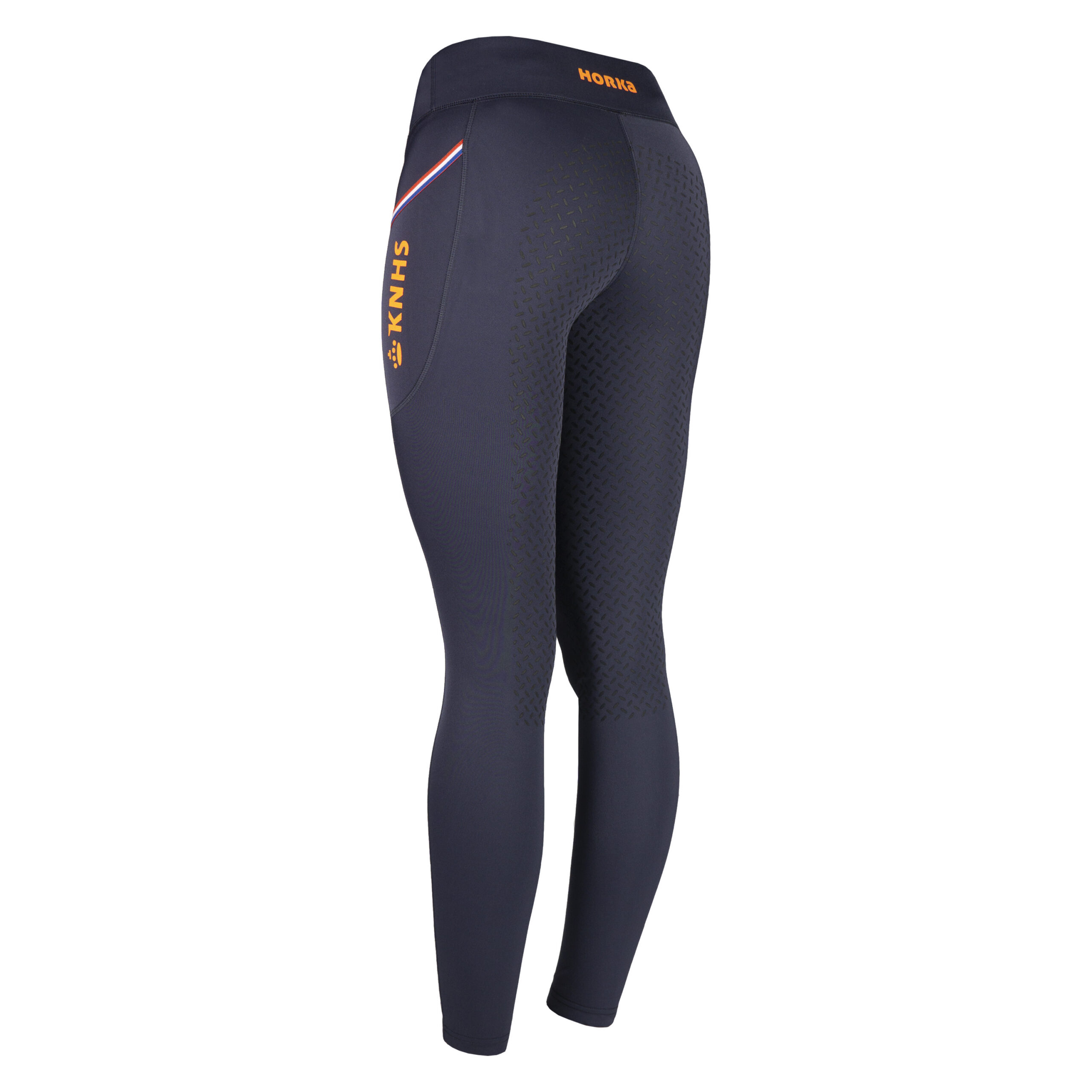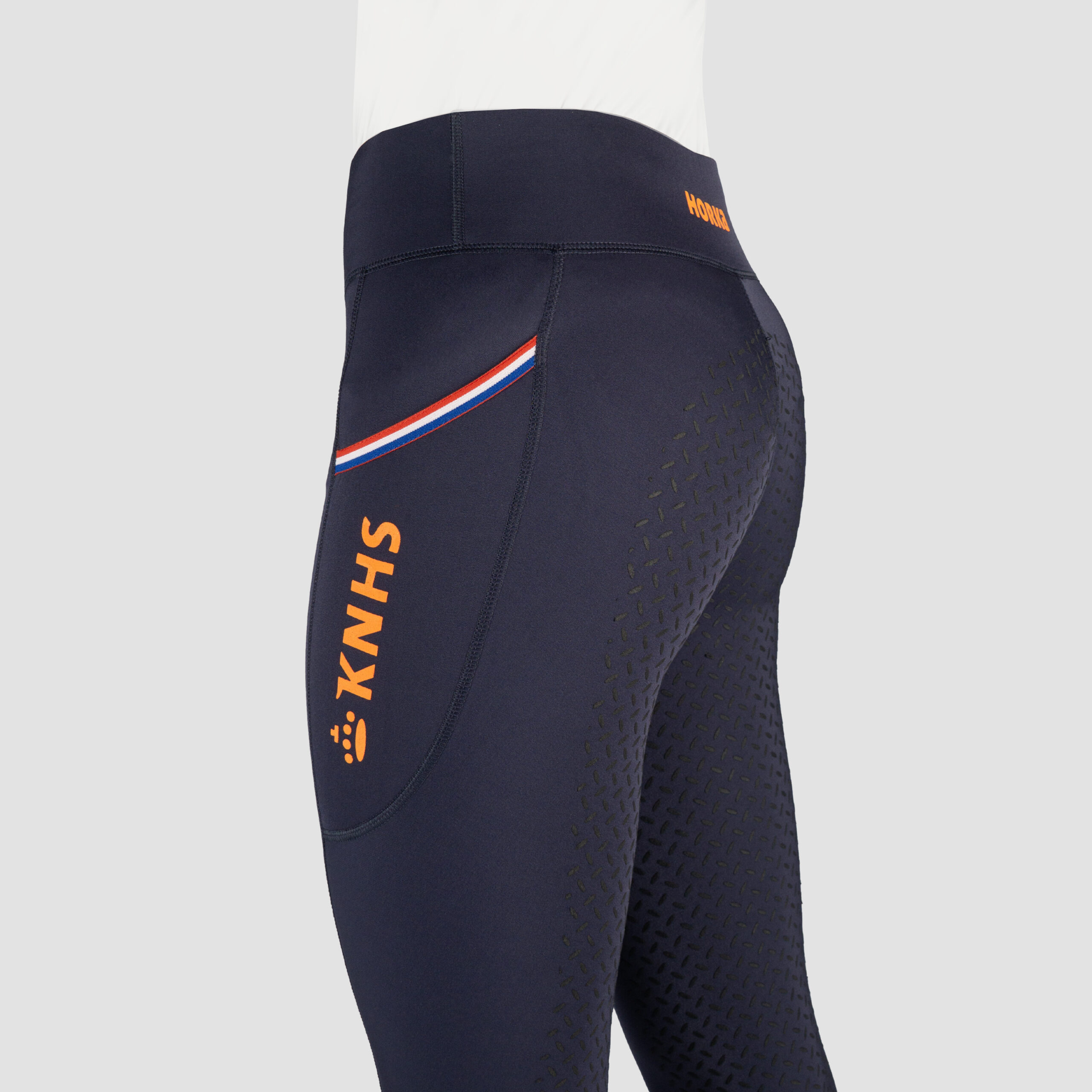 These stylish riding tights feature a full silicone seat for extra grip in the saddle. The riding tights have a wide elastic waistband and 2 side pockets suitable for all types of phones. Features orange details and a high-quality KNHS rubber print. Product specifications: Well-designed pull-up riding tights Wide elastic waistband High-quality KNHS rubber print Full silicone seat Note: Slim fit, if in doubt, take 1 size larger. Material: 90% micro nylon 10% Spandex
