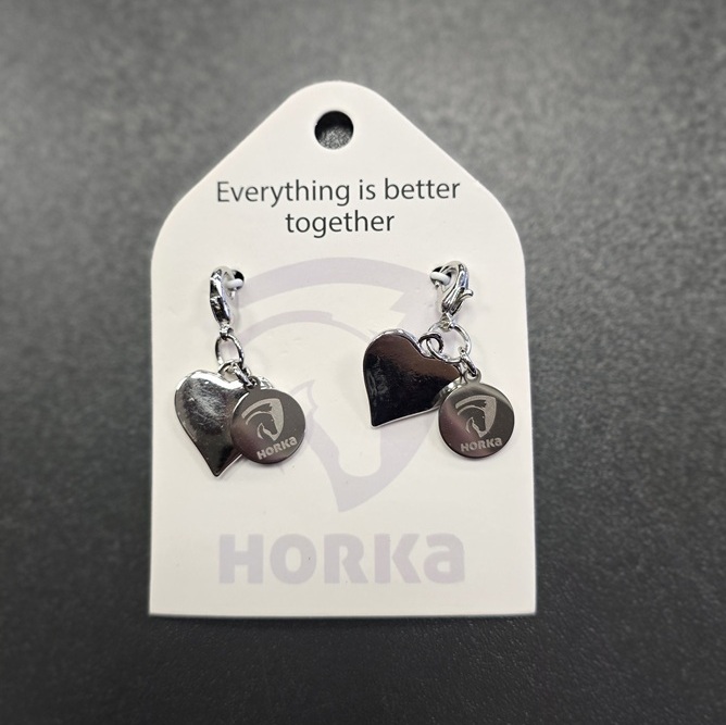 A cute double-heart lucky charm perfect for attaching to halters, zippers, bags or keys. The set includes two shiny heart-shaped pendants and a small round metal charm with the HORKA logo. The durable silver-tone clasps make it easy to attach or remove the charm anywhere you like.