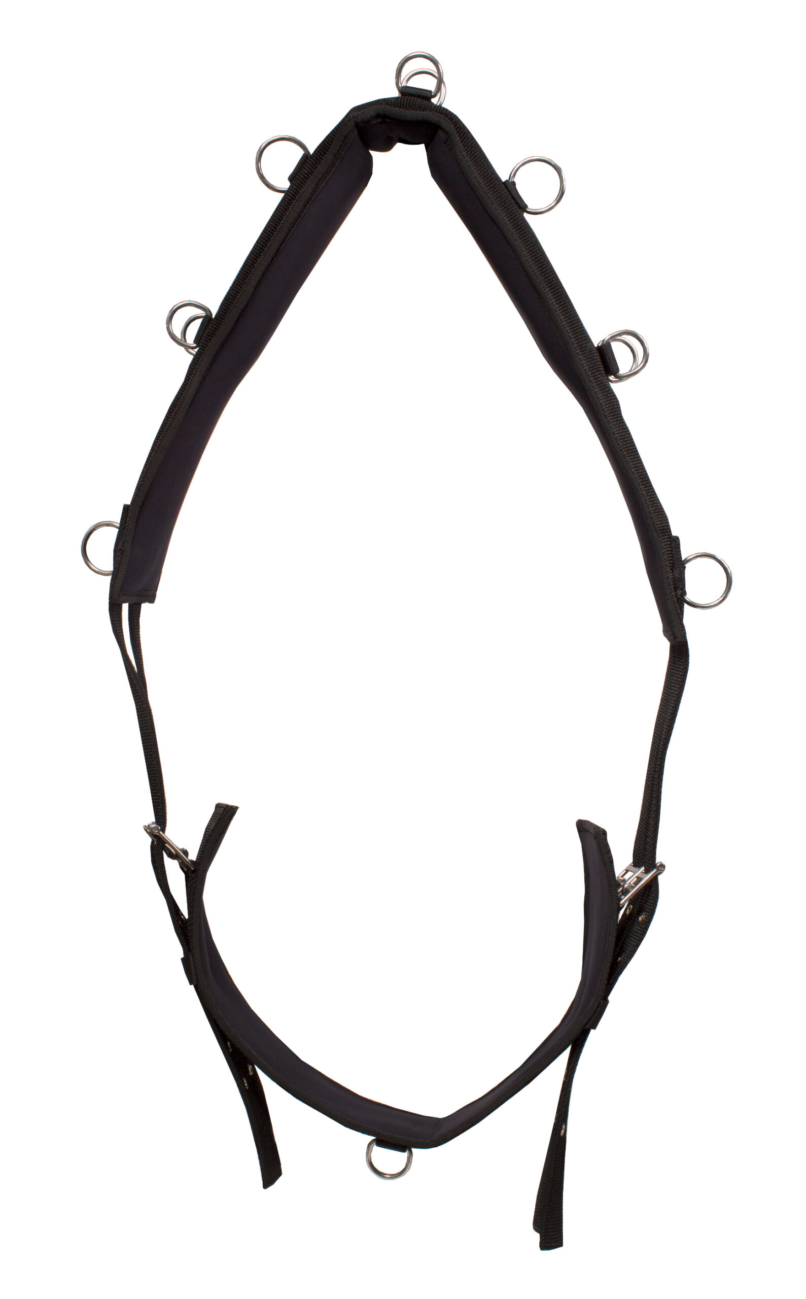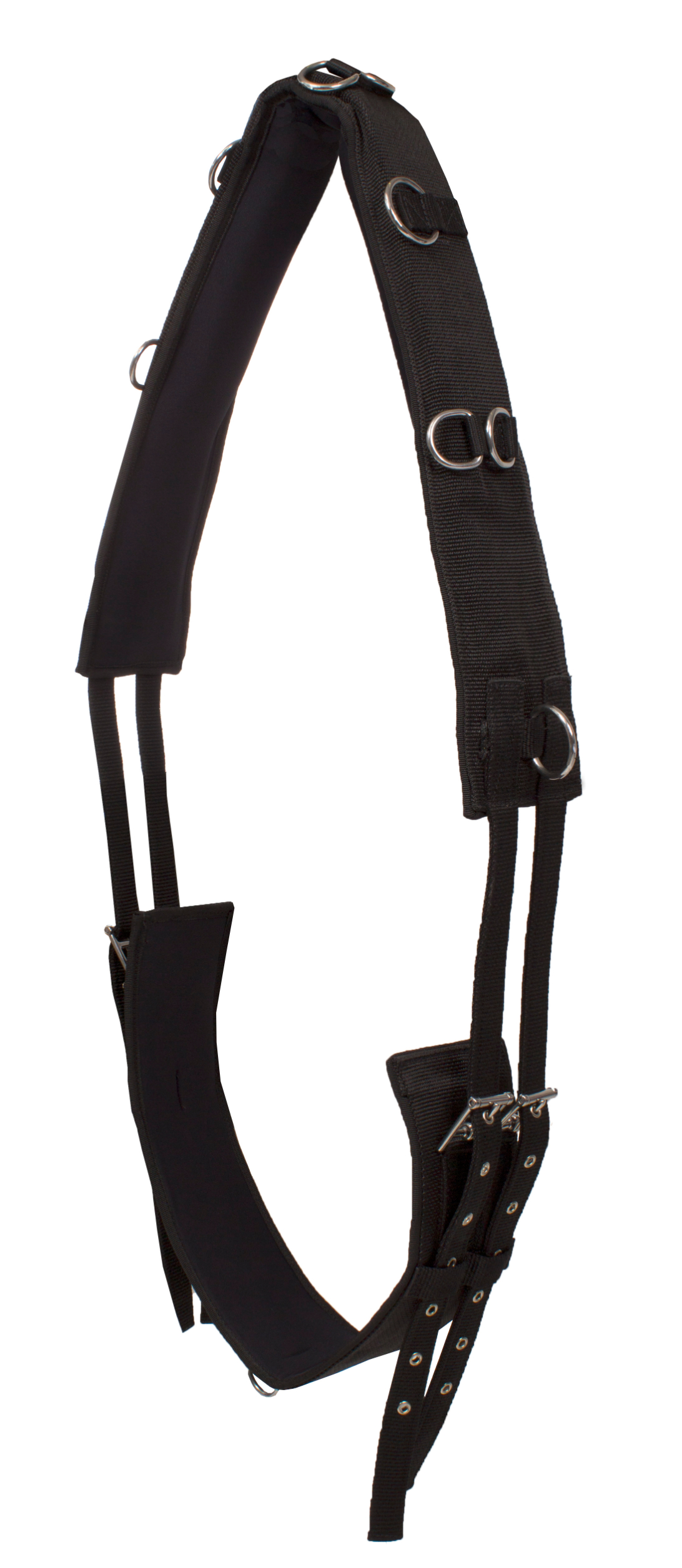 Nylon lunging girth with neoprene lining and wither pads to prevent slipping and turning. Product specifications: 2 large rings and 2 D rings on each side 2 D rings in the middle of the withers Can be girthed on 2 sides with roller buckles Sizes: Pony: 119 to 158 cm Cob: 155 to 191 cm Full: 180 to 218 cm