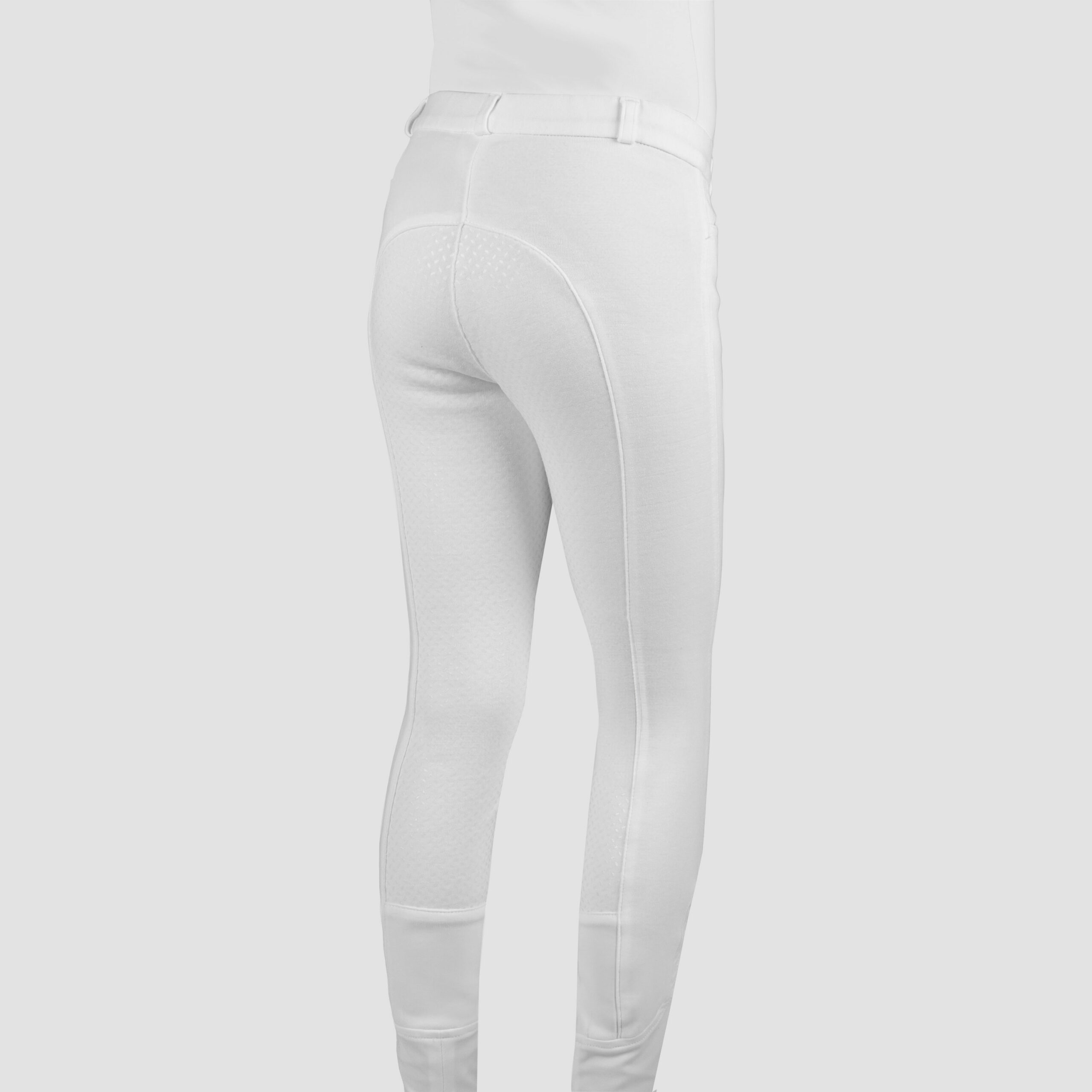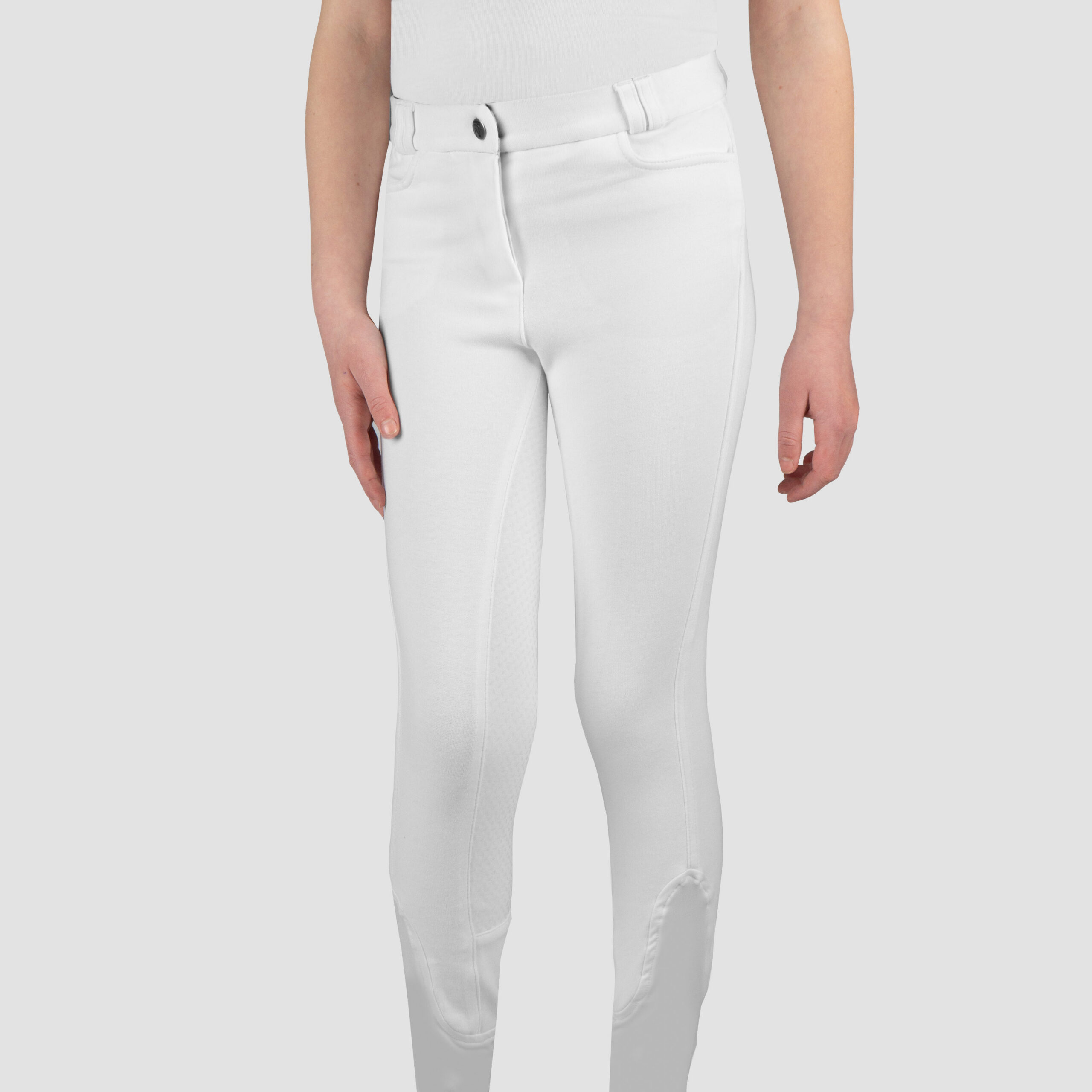 Basic ladies breeches with two front pockets and matte rice corn silicone full seat.