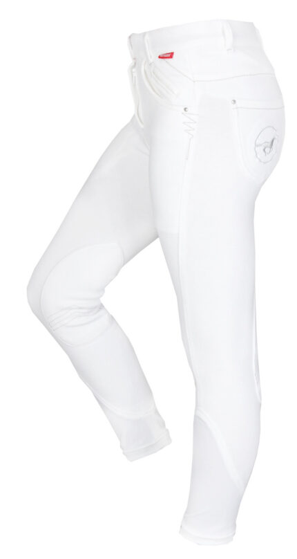 Cute cotton kids pull up breeches with adjustable elastic waistband and fake fly. This pull up breeches features Jolly Unicorn on the front.
