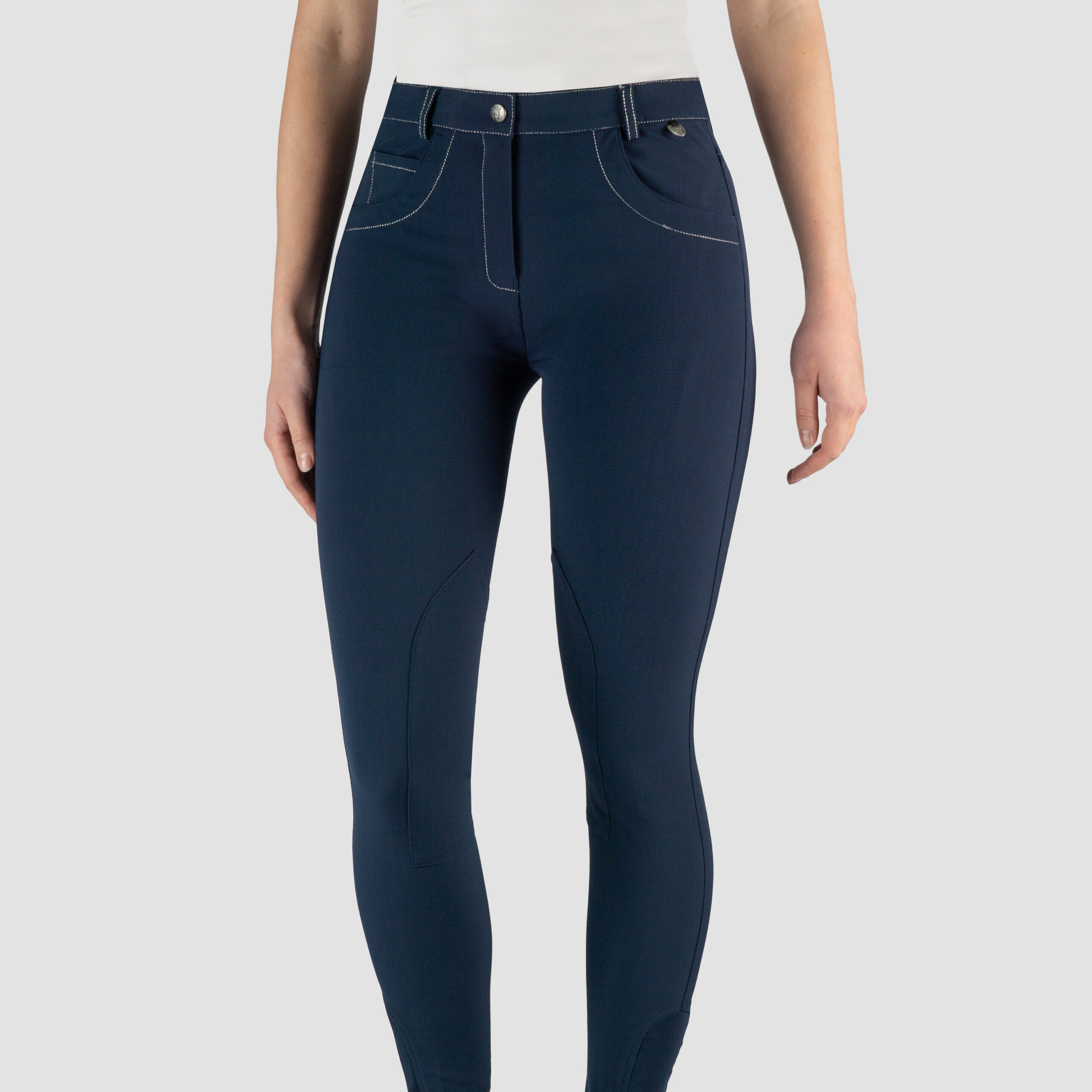Back by popular demand; mid rise ladies breeches with self fabric knee patches. The Quatar is done in micropolyester fabric with extra soft feel that features a flattering fit. The silver Lurex stitching allows for subtle glittery finishing touches. We like to call it a chique classic!