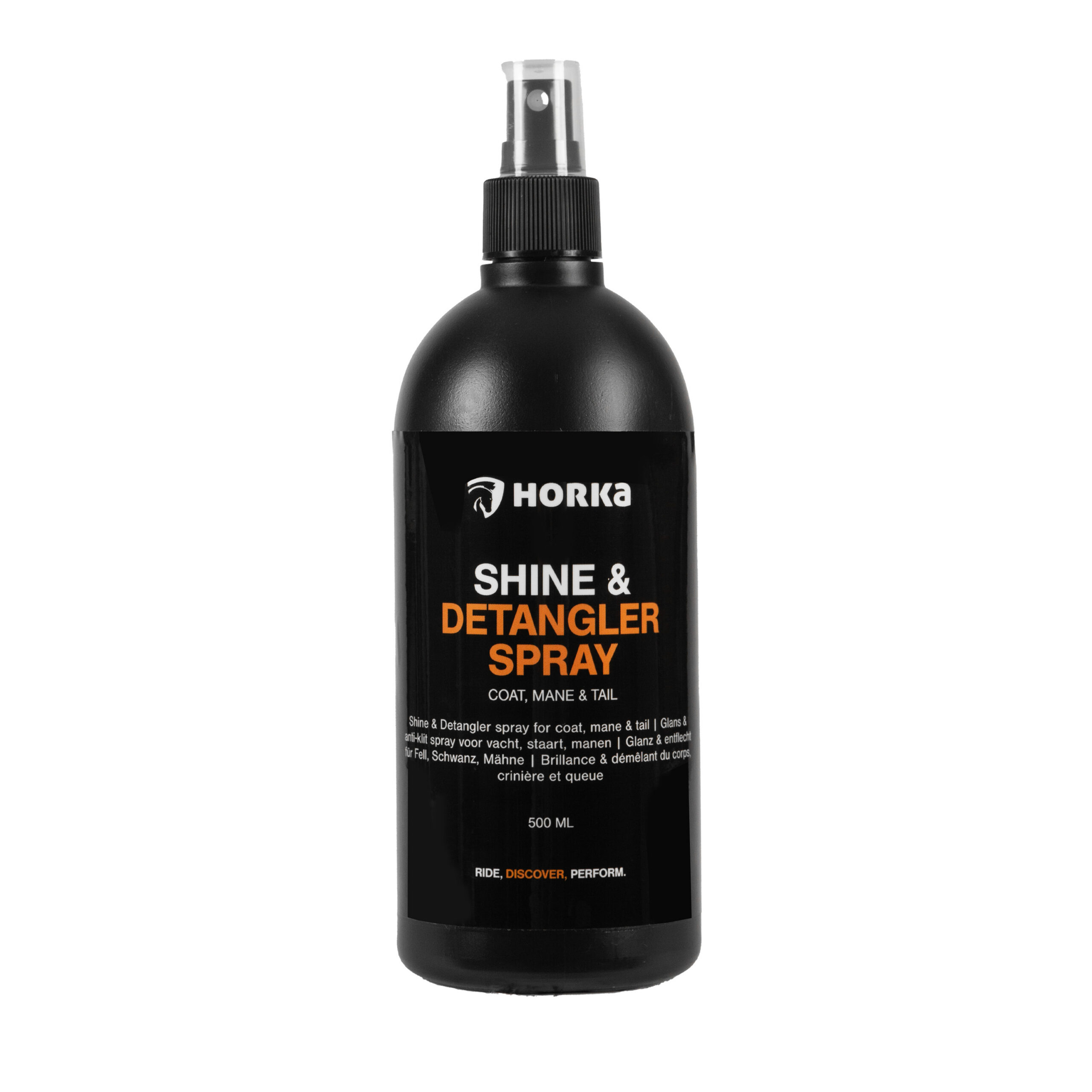 A spray to make the horse’s mane and tail shine and tangle-free. Knots are easier to comb out. Conditions and keeps the mane and tail tangle-free for 1 to 2 weeks. Directions for use: Spray evenly over the mane or tail. The tail should be dry to brush it out properly. Start from the bottom to brush out as little hair as possible and maximize the tail’s volume. Rinsing is not necessary. Wash the tail beforehand with HORKA shampoo step 1 for optimal results. VPE 100ML/12 200ML/6