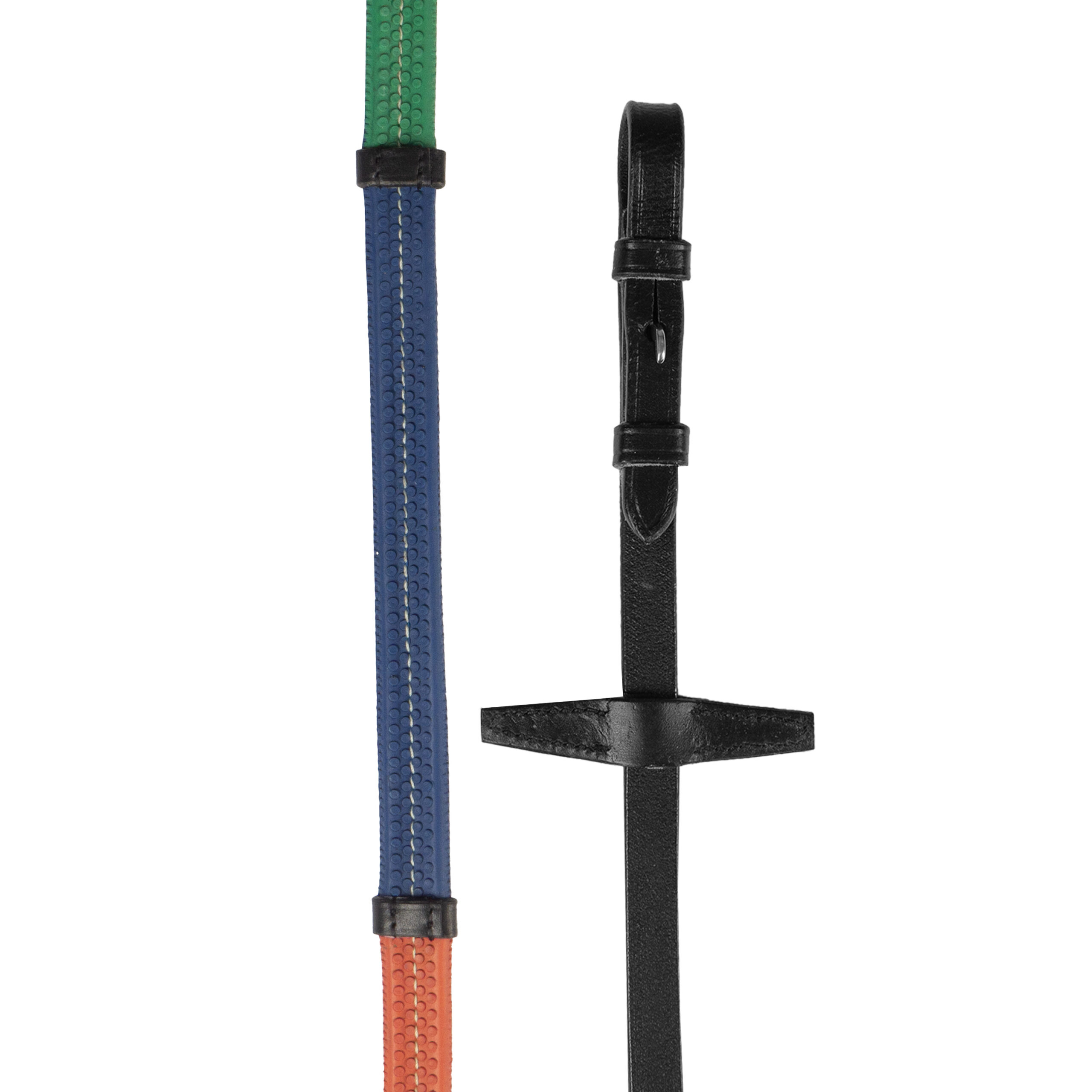 Colored rubber reins with 6 stops. Product specifications: 17 mm rubber, perfect for children. With 6 stops. Finished with black leather. Material: Leather, rubber, and metal.