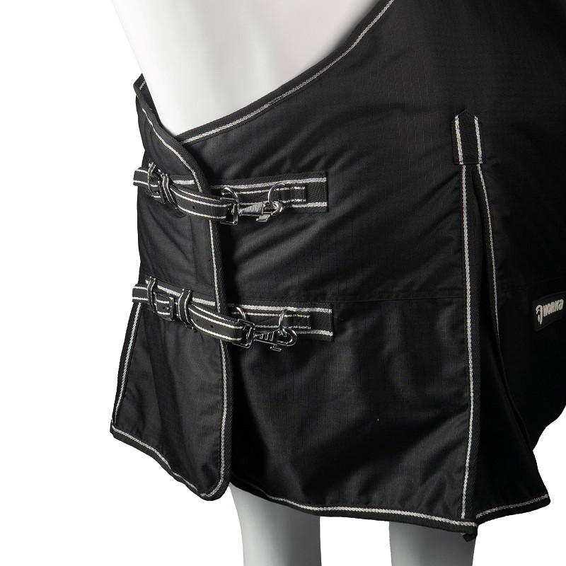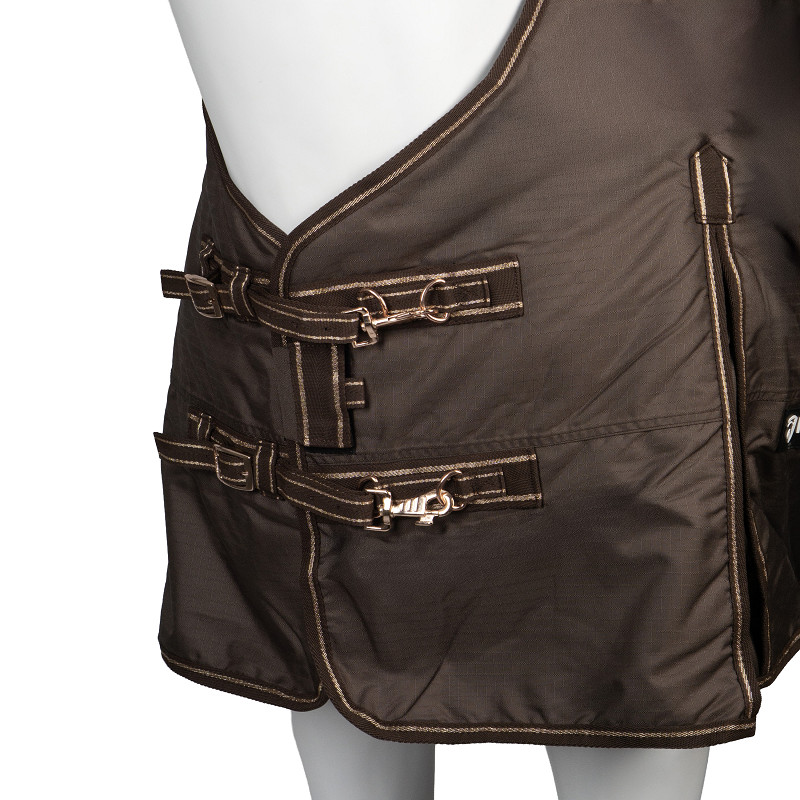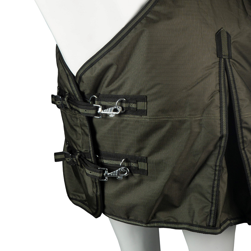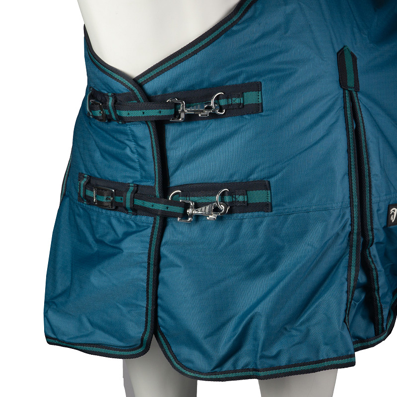 Outdoor rug Dime, to combine with loose neck 180337. The rug has a 200 gsm filling and polyester lining. On the chest a double closure with Velcro, buckleโs and snap hooks and crossed surcingleโs with elastic ends and rubber stops. Fur padded withers for extra comfort with D-rings to put a neck on.