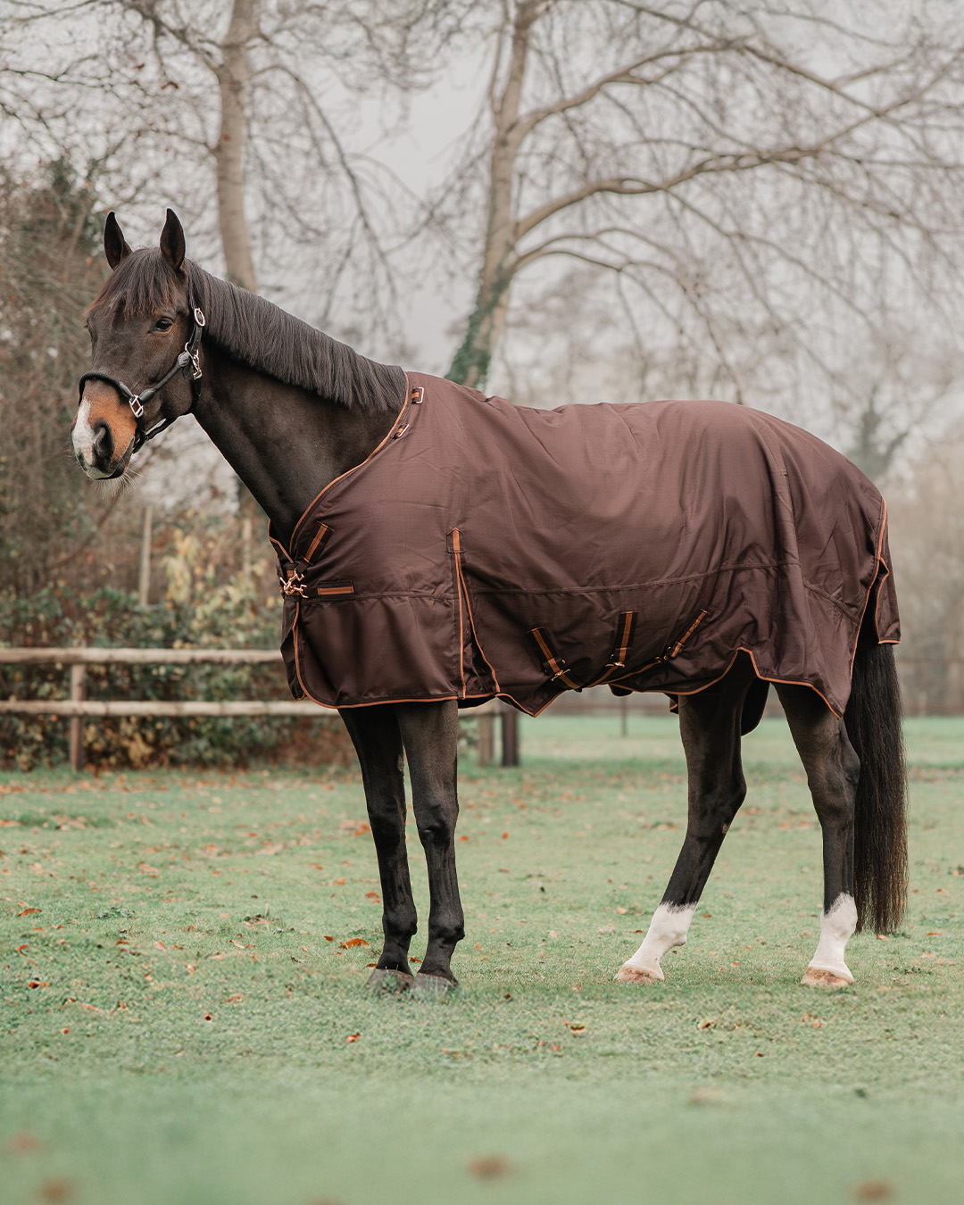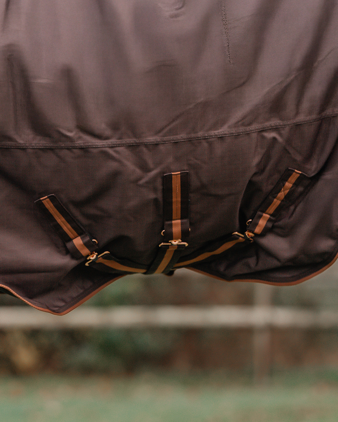 Modern and functional rug designed with the latest features. Made with a durable 1200D ripstop outer fabric that is waterproof and breathable for reliable protection and comfort. The 150 GSM filling and polyester lining provide warmth and softness. The rug features a practical V-neck closure, a removable neck cover attached with four loops, three surcingles for extra stability and a detachable PVC-covered tail cord.
