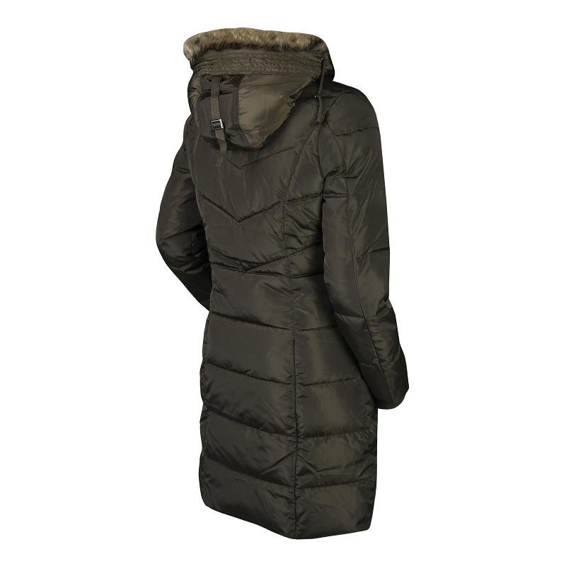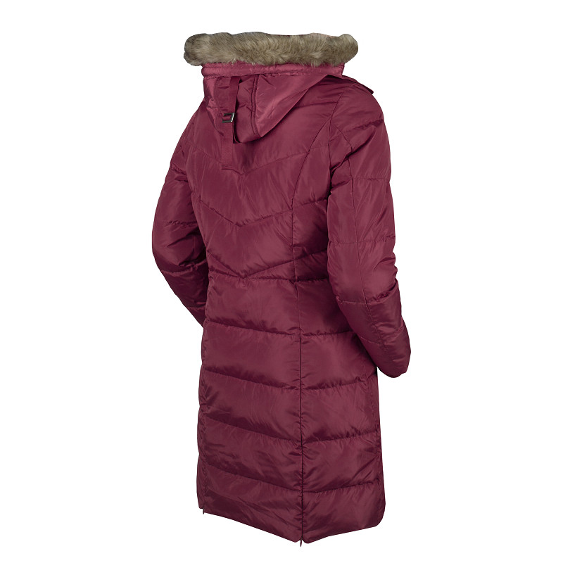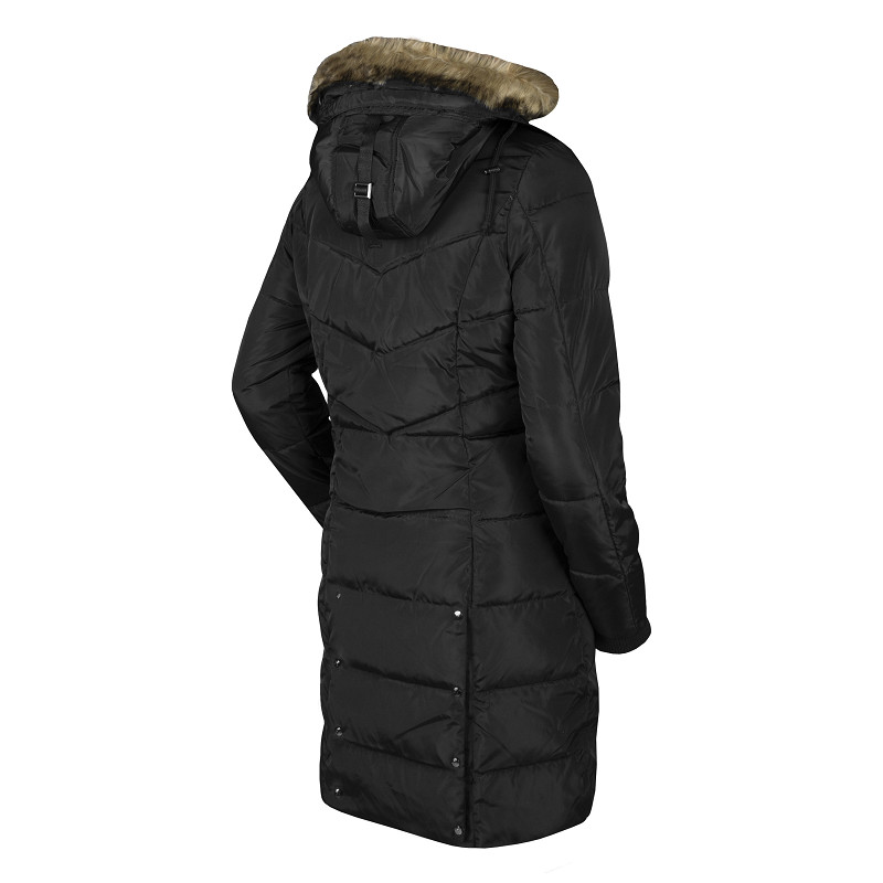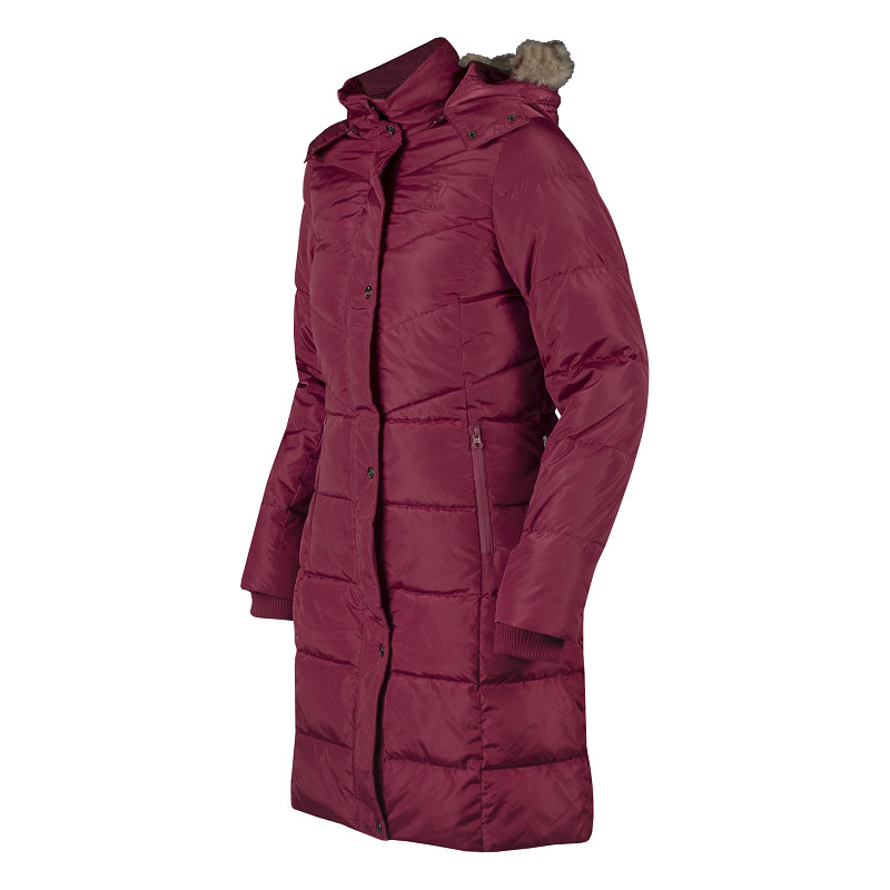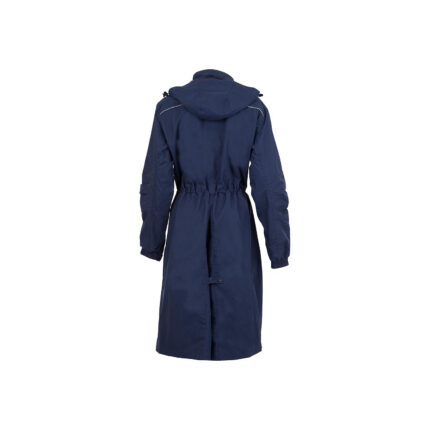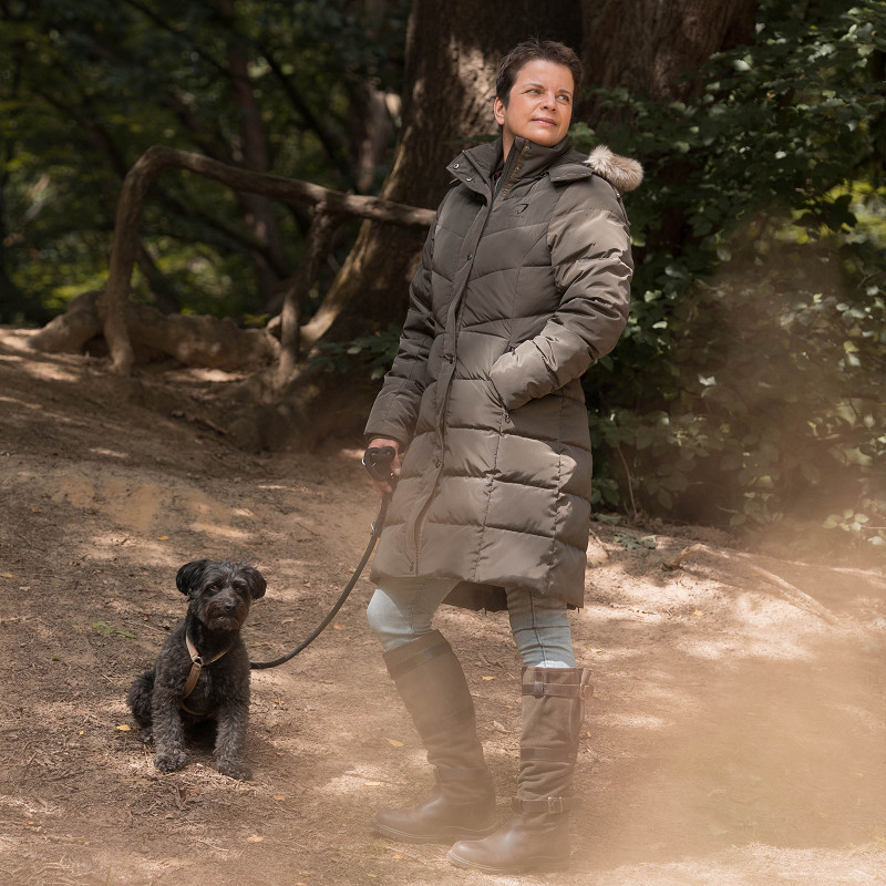 A long, warm wintercoat from extra waterrepellent material. The coat features a detachable hood and detachable faux fur on the hood. Waterproof zippers and warm fleece lining on the upper part of the inside make this coat perfect for those blistery times at the side of an arena! The coat also has backsplits with zippers, for comfortable movement in the saddle.