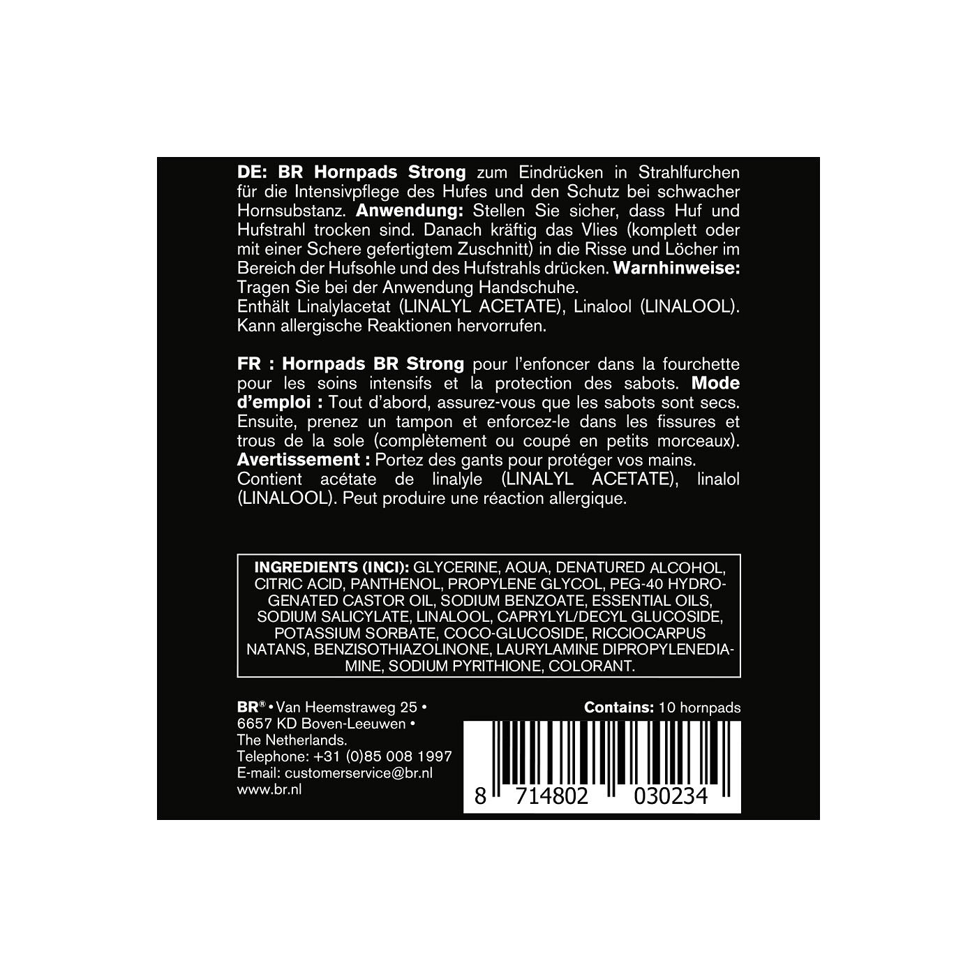 The BR Hornpads Strong are moist pads with caring properties to press into the frog for intensive care of the hoof and protection against infections. Content: 10 pieces.
