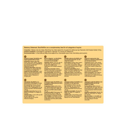 Healthy and delicous horse muffins, 100% handmade. Each treat contains grains such as wheat, oats, barley and corn, and is fortified with flaxseed and fenugreek. This additional treat is especially fit for use as a snack or reward for your horse or pony. Display contains 30 wrappers. Each wrapper contains 3 snacks.