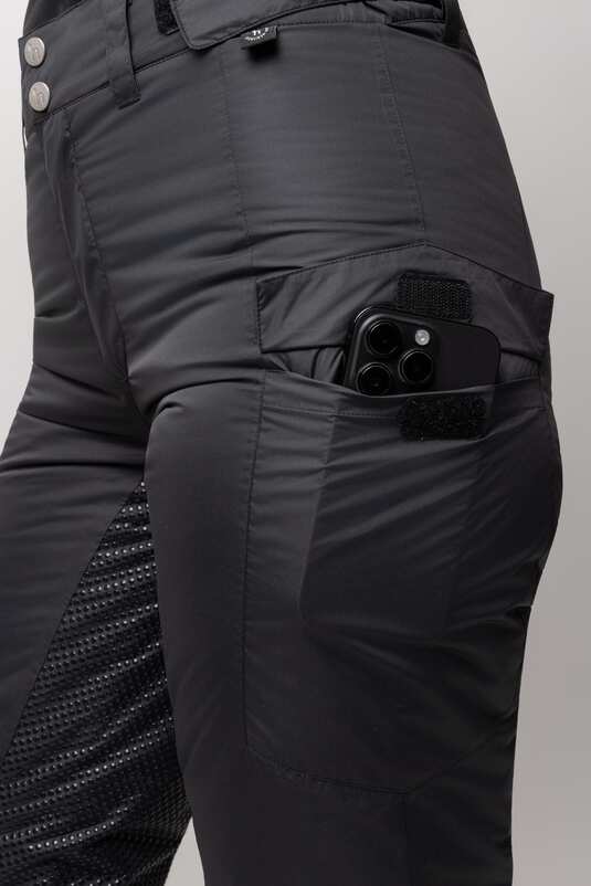 The Horze Annica Womenโs Padded Breeches offer warmth, comfort, and grip in cold conditions. Made from waterproof, windproof fabric with taped seams, they provide reliable protection from the elements. The silicone full seat ensures excellent grip, while the high waistband adds comfort. Practical features include thigh pockets with hook-and-loop closure, leg zippers, and removable elastic straps. Adjustable waist straps make them fit perfectly for long days at the stable.