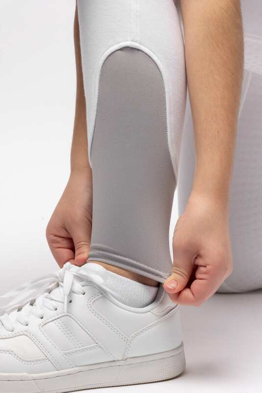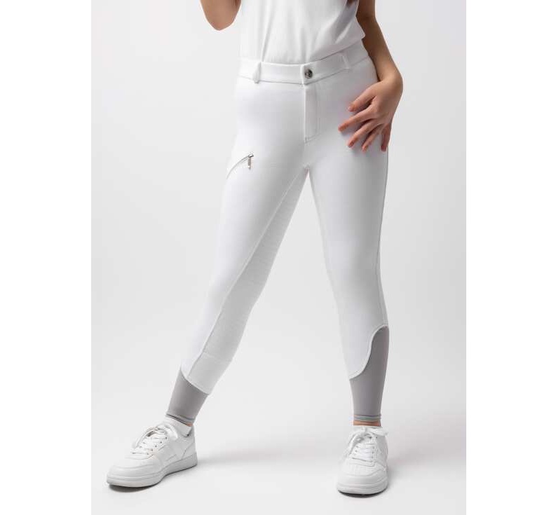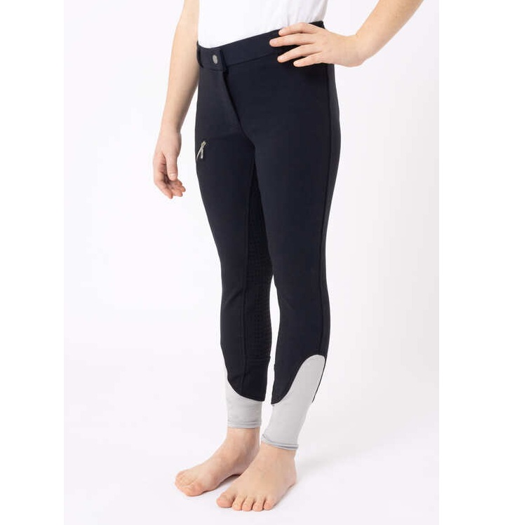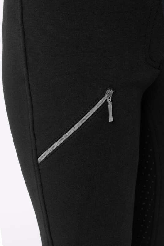 These kids’ full grip breeches combine comfort and functionality, making them a great choice for young riders. The soft material ensures a comfortable fit, while the belt loops allow for a secure adjustment. A convenient zippered phone pocket on the thigh provides easy access to essentials. The elastic leg bottoms in a contrasting color add a stylish touch and ensure a snug fit inside riding boots. Perfect for both training and everyday riding.