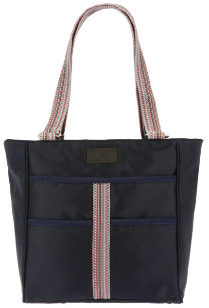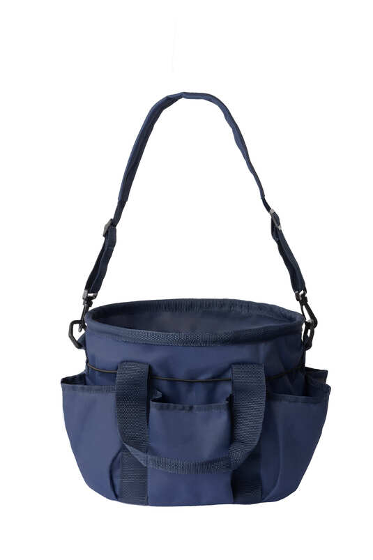 Organize your grooming goods in this durable nylon bag. A large center compartment surrounded by six outer pockets gives you plenty of room to organize and transport grooming brushes, tools, and anything else you want to stash. An elastic snap band wraps the outside of the tote to secure items stored in outside pockets. Carry this cute tote or add the padded, adjustable shoulder strap when you have your hands full. Color-coordinated handles and trim. Large inner compartment. Plastic knob feet. Adjustable, removable shoulder strap.