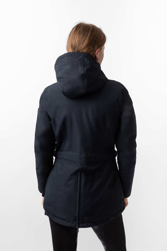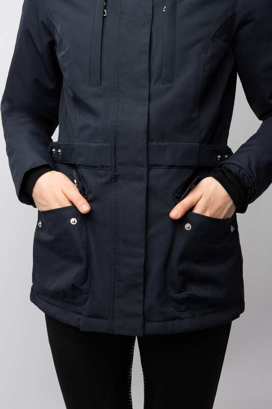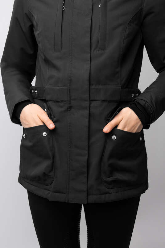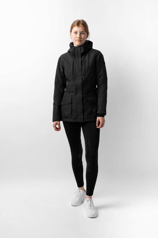 Jadine sรผgis-/talvejope on valmistatud vastupidavast veekindlast materjalist (3000 mm) ning hingav kangas tagab hea รตhuringluse ka treeningu ajal. Jope on รผhtaegu kerge ja soojustatud, pakkudes mugavust nii tallis kui ka sadulas. Seljaosal olev lukk annab liikumisvabadust ratsutamisel, eemaldatav kapuuts lisab praktilisust. Mitmed lukuga ja klapiga taskud sobivad ideaalselt telefoni, vรตtmete vรตi maiuste hoidmiseks. Kahesuunaline esilukk teeb jopest mugava valiku ka sadulas kandmiseks.