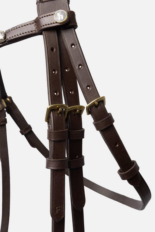 The Horze Somerset Bridle is cut anatomically and padded at nose and neck, giving your horse the highest comfort. The U-shaped brow band with sparkly crystals adds an elegant look. Convenient snap buttons make it easy to change if you need a plain brow band. Metal fittings match the soft nappa leather of the bridle perfectly.