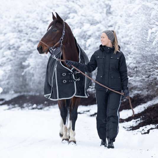 Warm, thick soft parka-like lining will make cold weather rides fun and enjoyable. These winter riding breeches with a full seat and stylish reflective side piping look great but provide extreme comfort for cold weather riding. The detachable suspenders will keep them in place, and the side zippers make them a breeze to put on and take off. The water repellent, thick, padded material will keep wet out and warmth in.