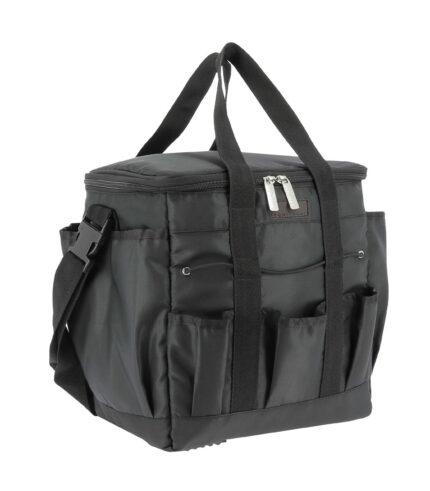 Keep your grooming tools organized in this handy tote. This durable nylon tote arrives to you with six high quality-grooming tools. Large wood base body brush removes dirt, dust, dried sweat, and dandruff from the coat and skin. Medium wood base body brush removes dirt, dust, and scurf from the coat and skin. Smaller than the body brush for use on the head and other sensitive areas. Wood back dandy brush removes heavy dirt and dried mud. Wood mane and tail brush untangles the mane and tail (pick out tangles first). Sisal gloves removes stains, or for a final polish after grooming. Also good for rubbing out sweat marks. Sisal towel for the final touch! Get a beautiful shine and rub out any remaining sweat marks.