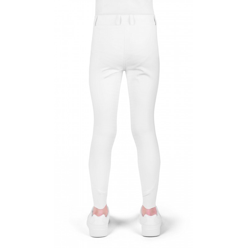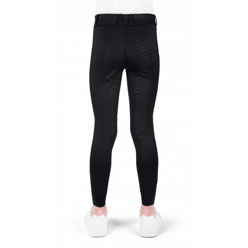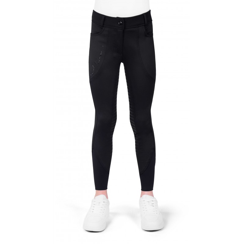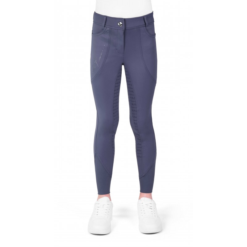 A children’s breech that combines comfort, style, and optimal performance in the saddle. – Comfort and grip: Full silicone seat and Lycra-finished lower legs. – Subtle elegance: “Equithรจme je tโaime” rhinestone branding on the side and a tailored fit. – Optimal support: High waistband with belt loops. DETAILS: – Front closure with zip and button. – Stretchy, breathable fabric with quick-drying properties. – Also available in adult sizes. COMPOSITION: Main fabric: 87% polyester, 13% elastane.