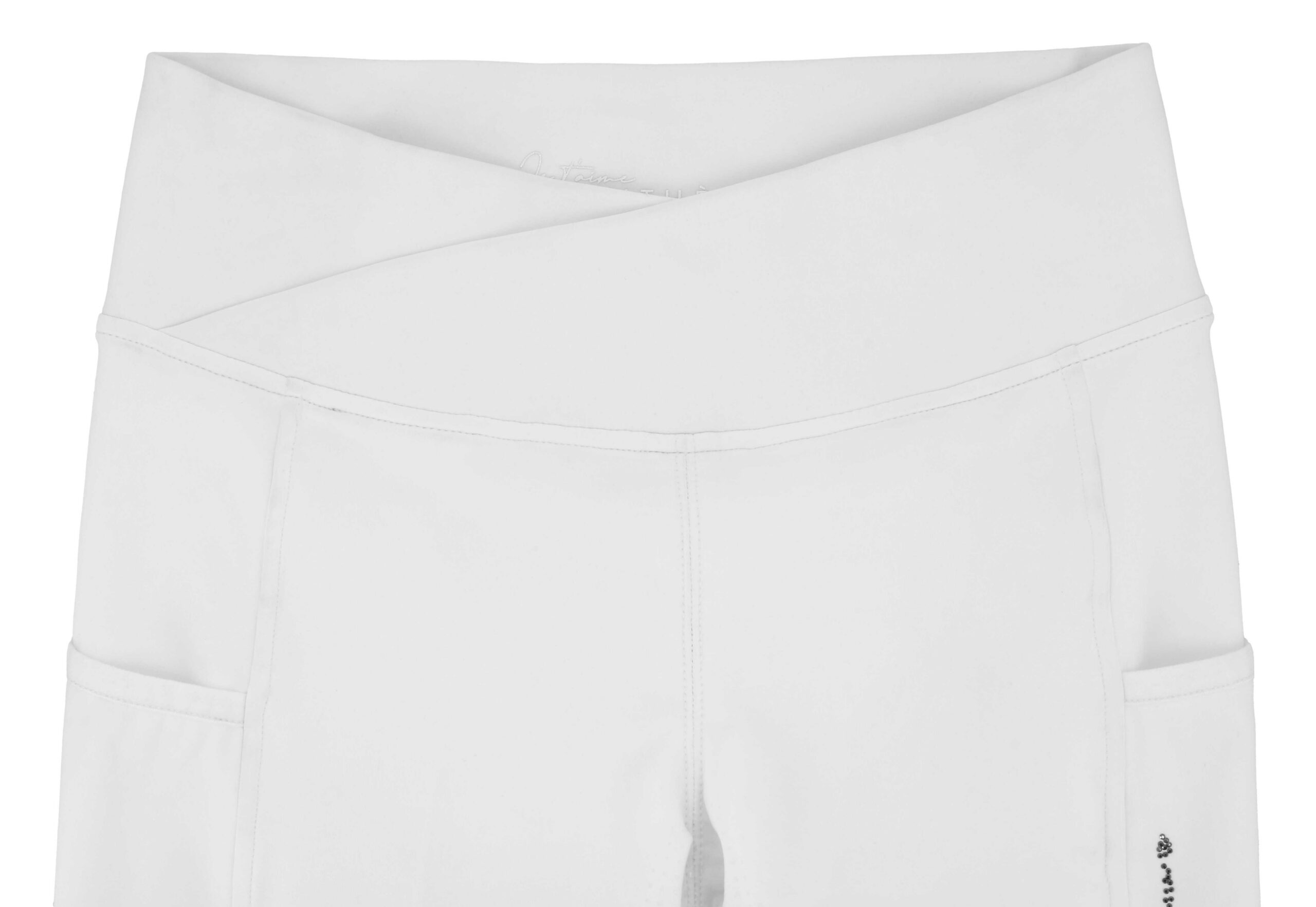 Riding leggings with a crossed waistband.- Stretch and comfortable: Lightweight and breathable fabric.- Original design: Wide, crossed “Tulip” waistband.DETAILS:- Silicone bottom.- Phone pocket on each side.- “Je t’aime” rhinestone branding on the side of the pants.COMPOSITION:Main material: 78% polyester, 22% elastane.Waistband: 75% polyamide, 25% elastane.