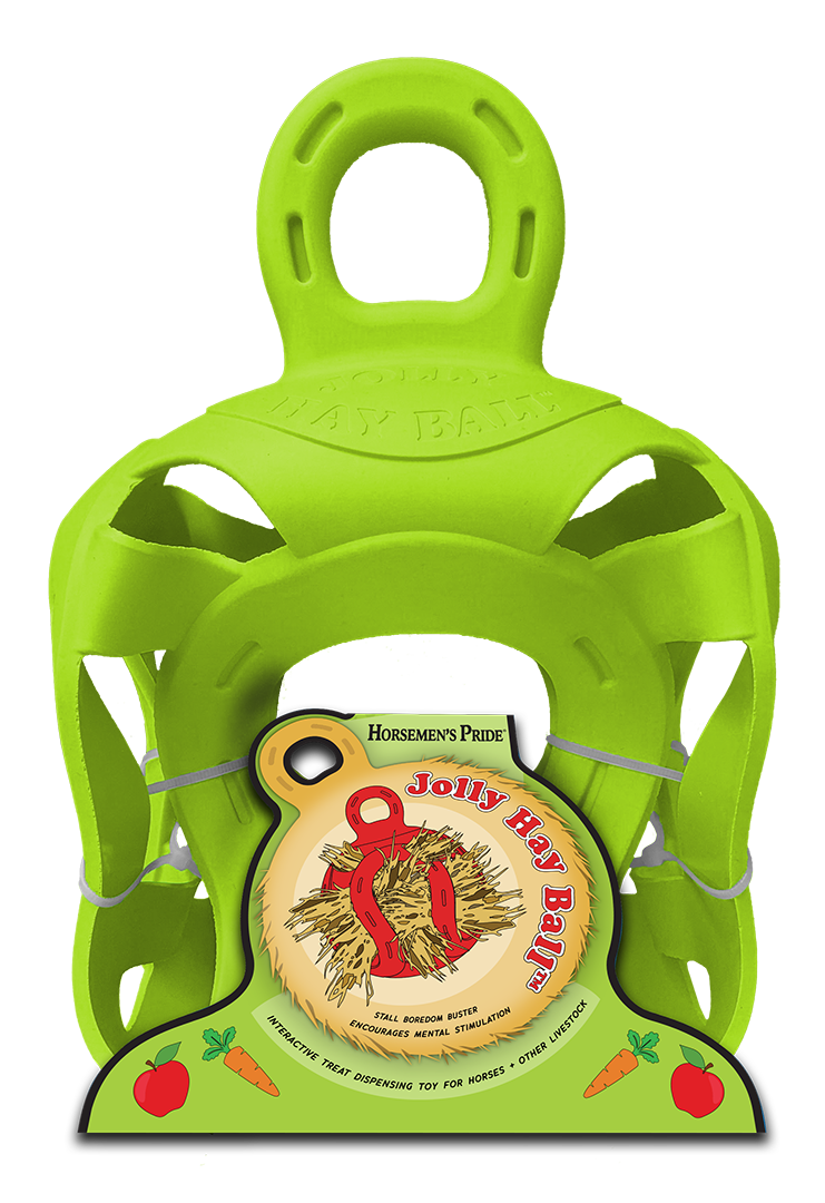 Fill the Jolly Hay Ball with hay and fill the smaller openings with treats like apple or carrot. This will keep your horse busy for a while.