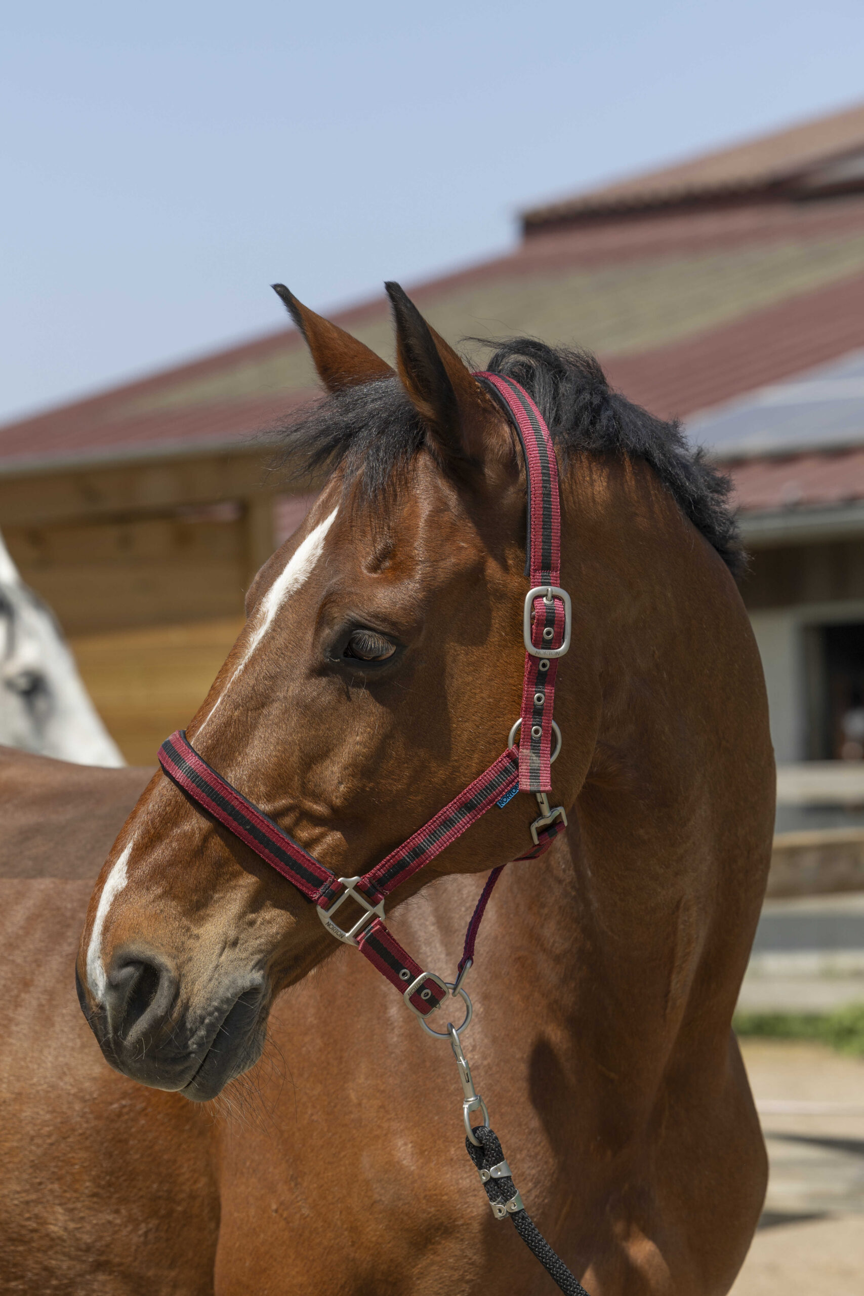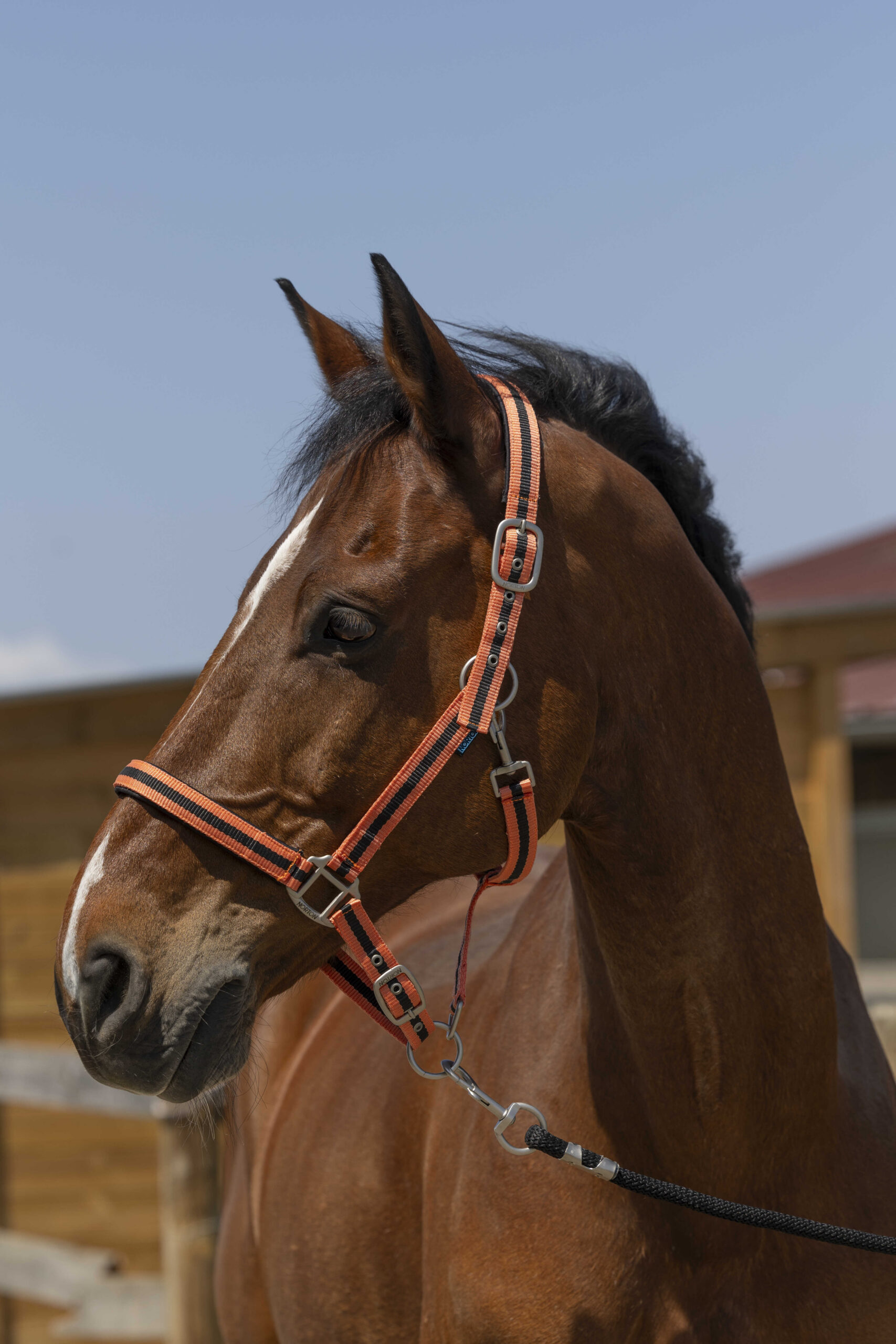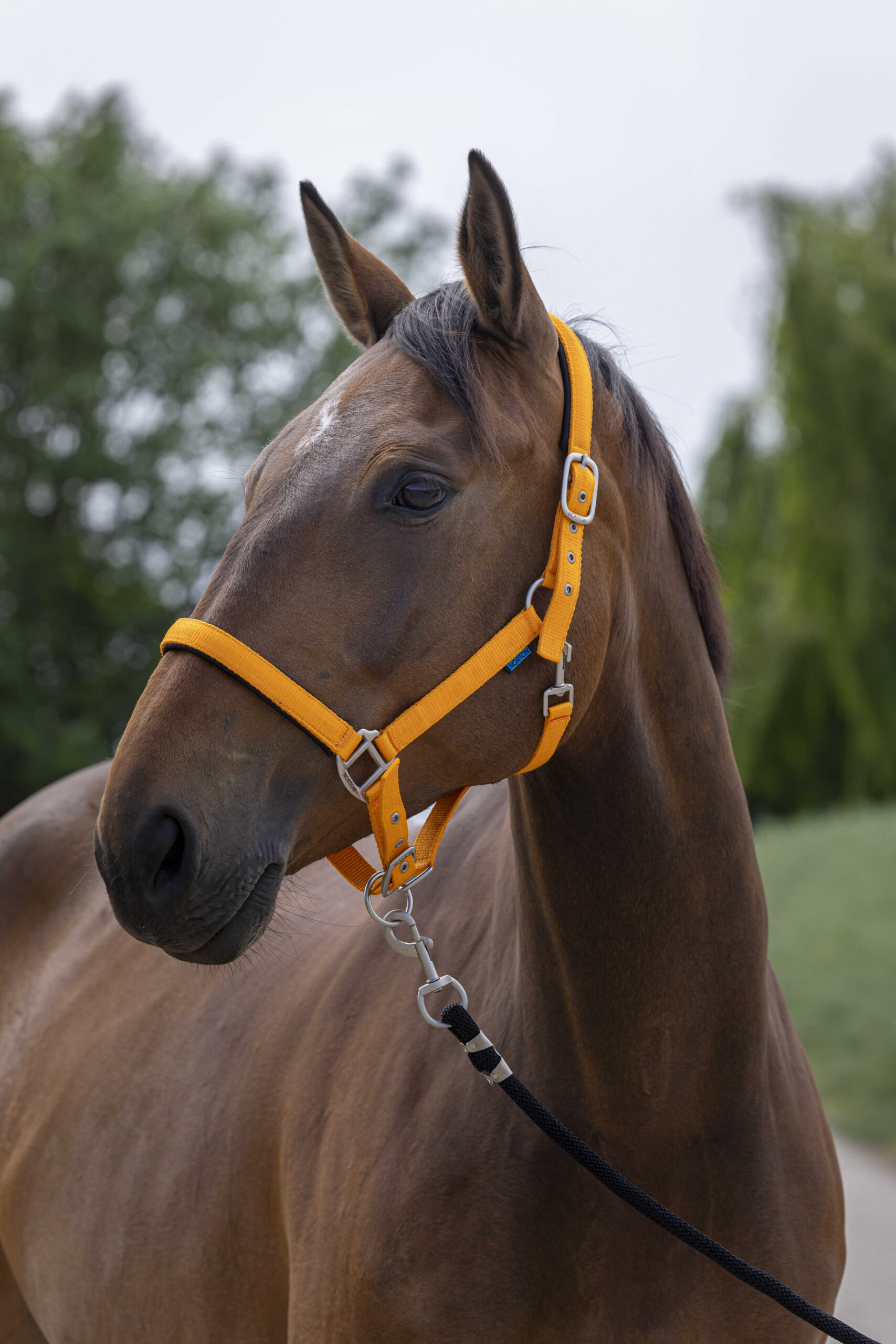 Polypropylene halter with adjustable headpiece and noseband with throat latch. – Neoprene lined noseband and headpiece. – Satin metal buckle printed with the NORTON logo.