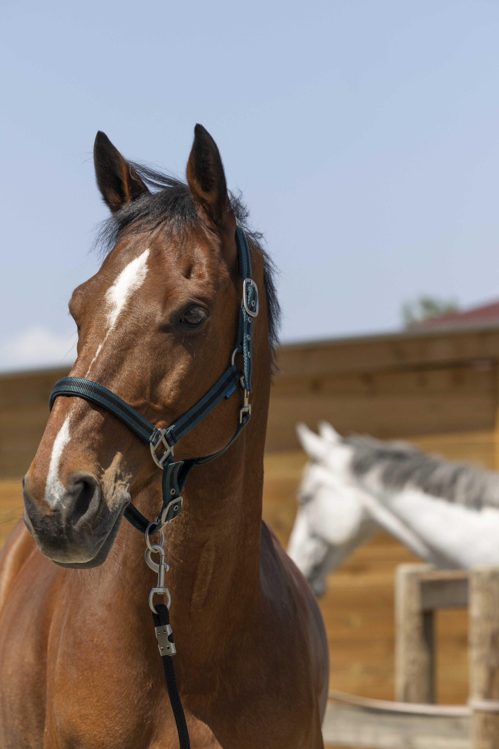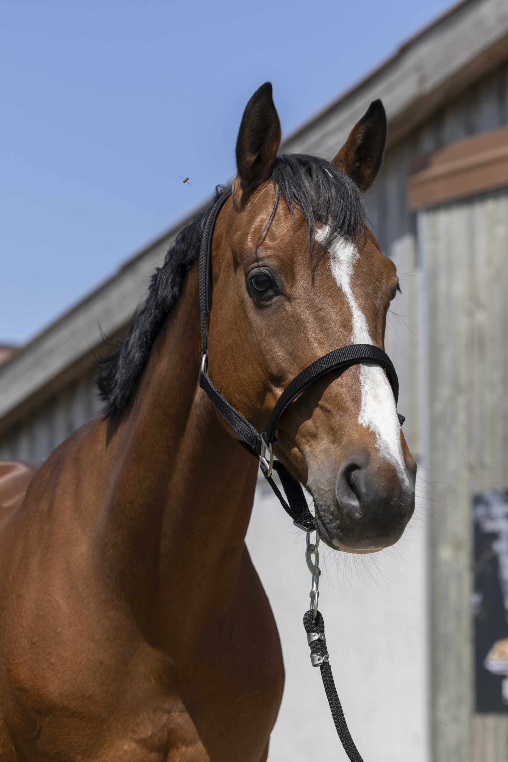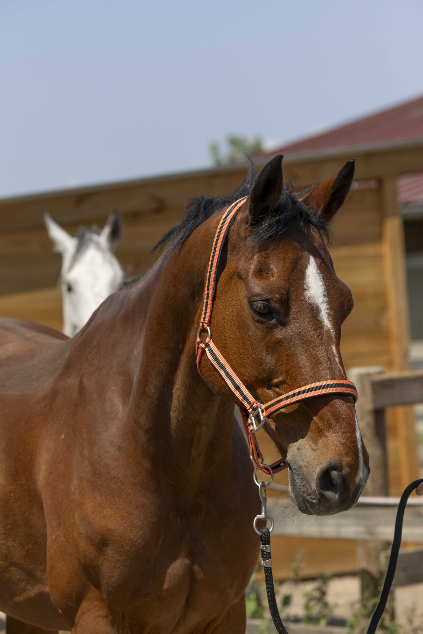 Polypropylene halter with adjustable headpiece and noseband with throat latch. – Neoprene lined noseband and headpiece. – Satin metal buckle printed with the NORTON logo.