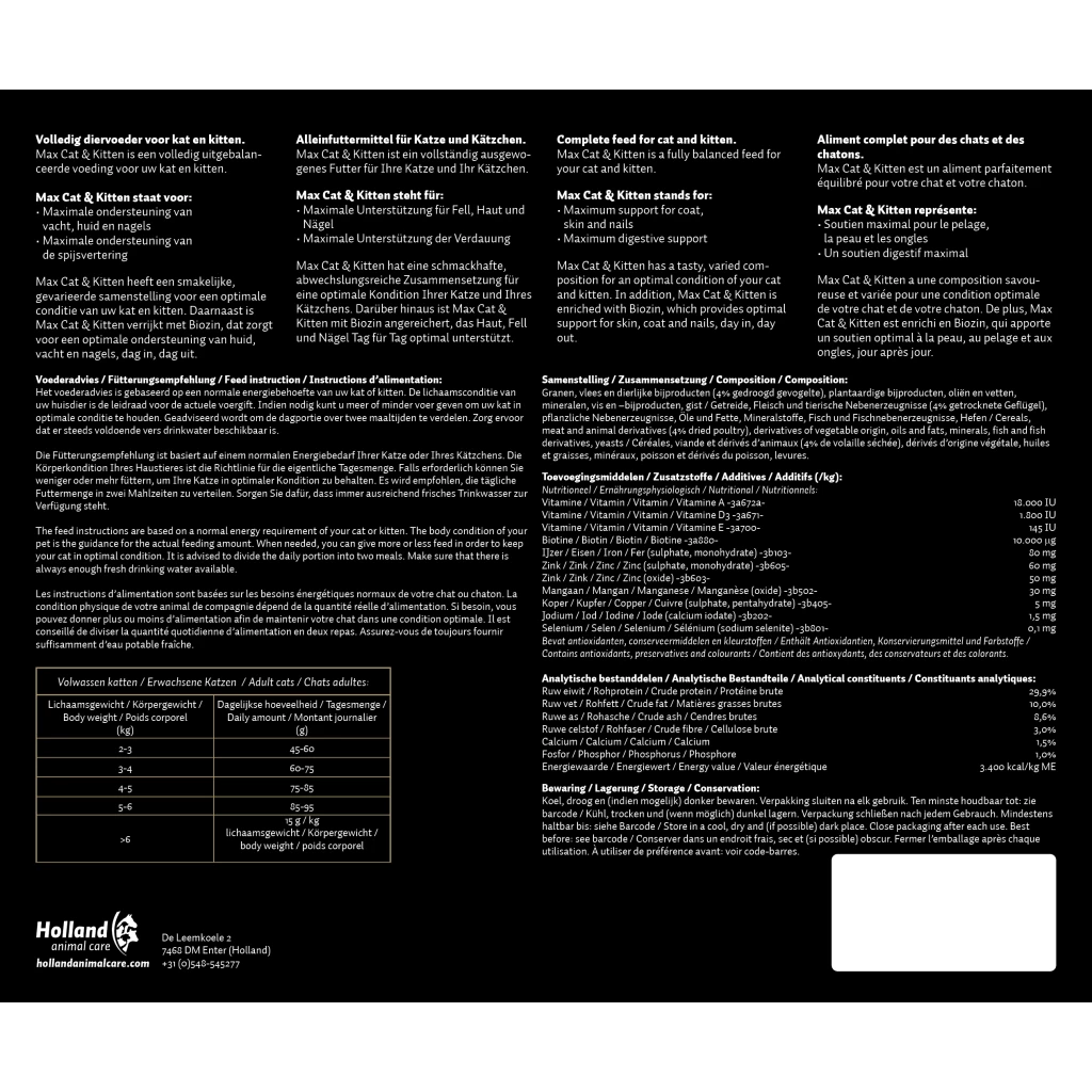 Max Cat and Kitten is a Super Premium Plus food in pellet form and contains high-quality ingredients. By adding the dietary supplement Biozin, Max Cat and Kitten is the most complete food for cats and kittens.