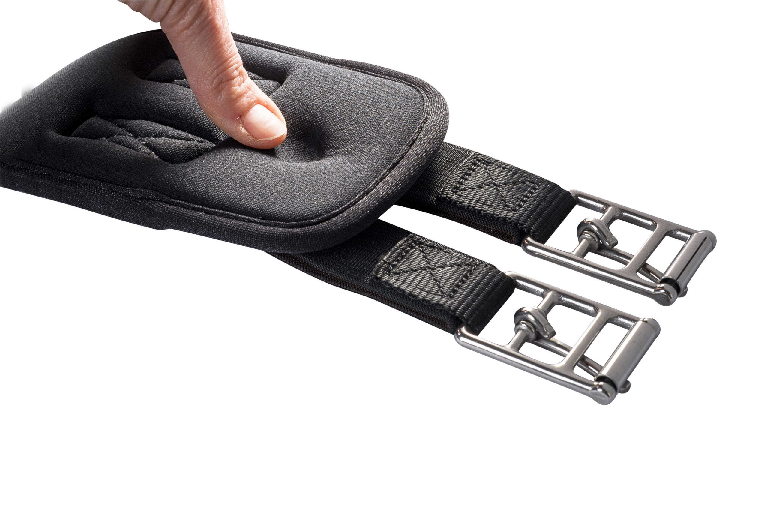 Memory foam inner layer. The nylon outer shell features sewn-on polypropylene reinforcement bands, while the inner lining features absorbent polyester mesh and a chafing-resistant edging. A central ring for auxiliary reins and stainless steel roller buckles on polypropylene suits with two-layer elastic straps on the left side.