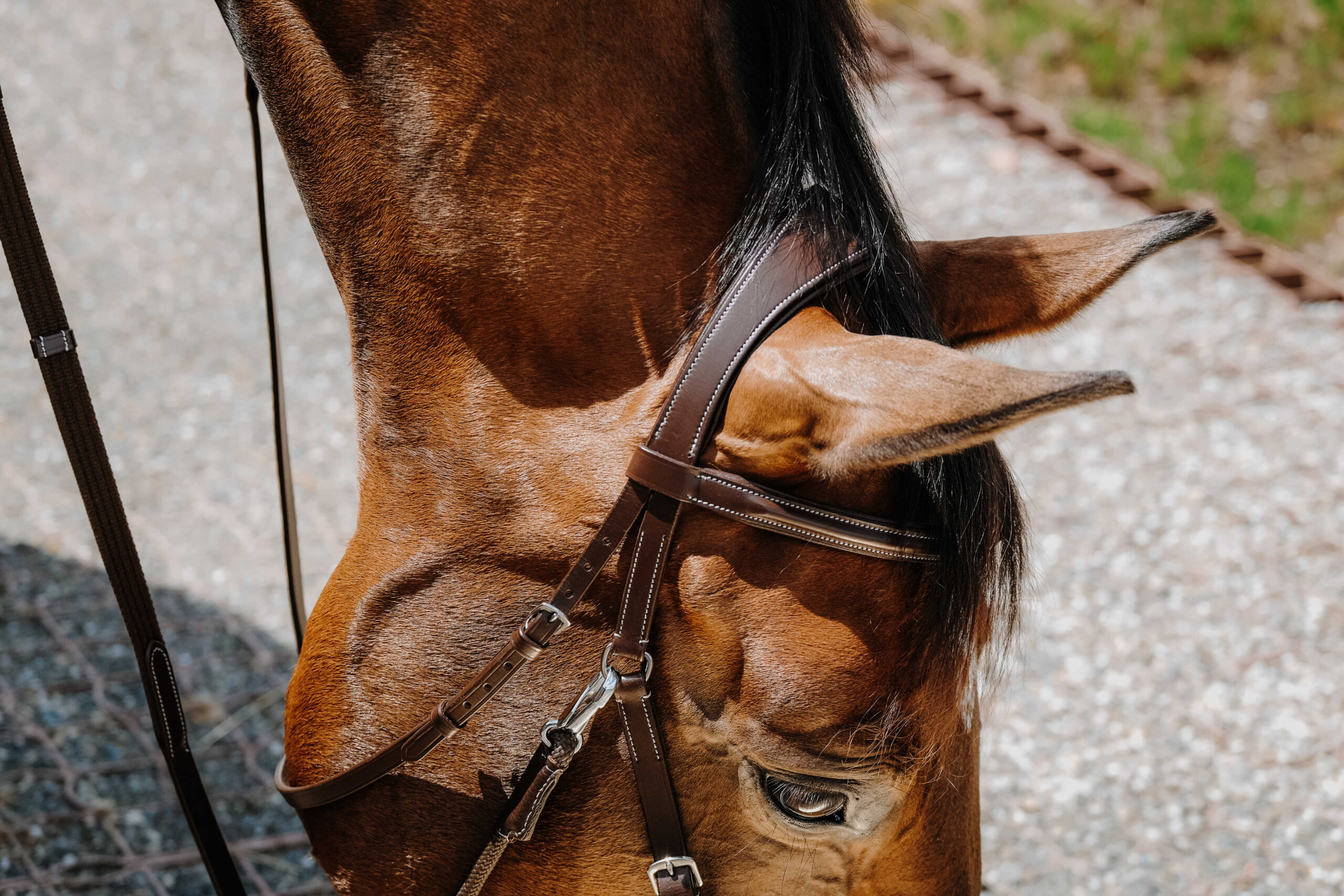 – Anatomical comfort: Bitless design. Cross surcingles under the cheek pieces, connected to the reins via fixed rings.