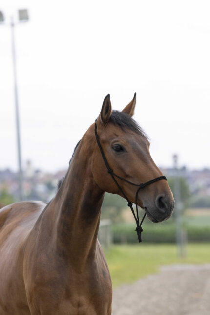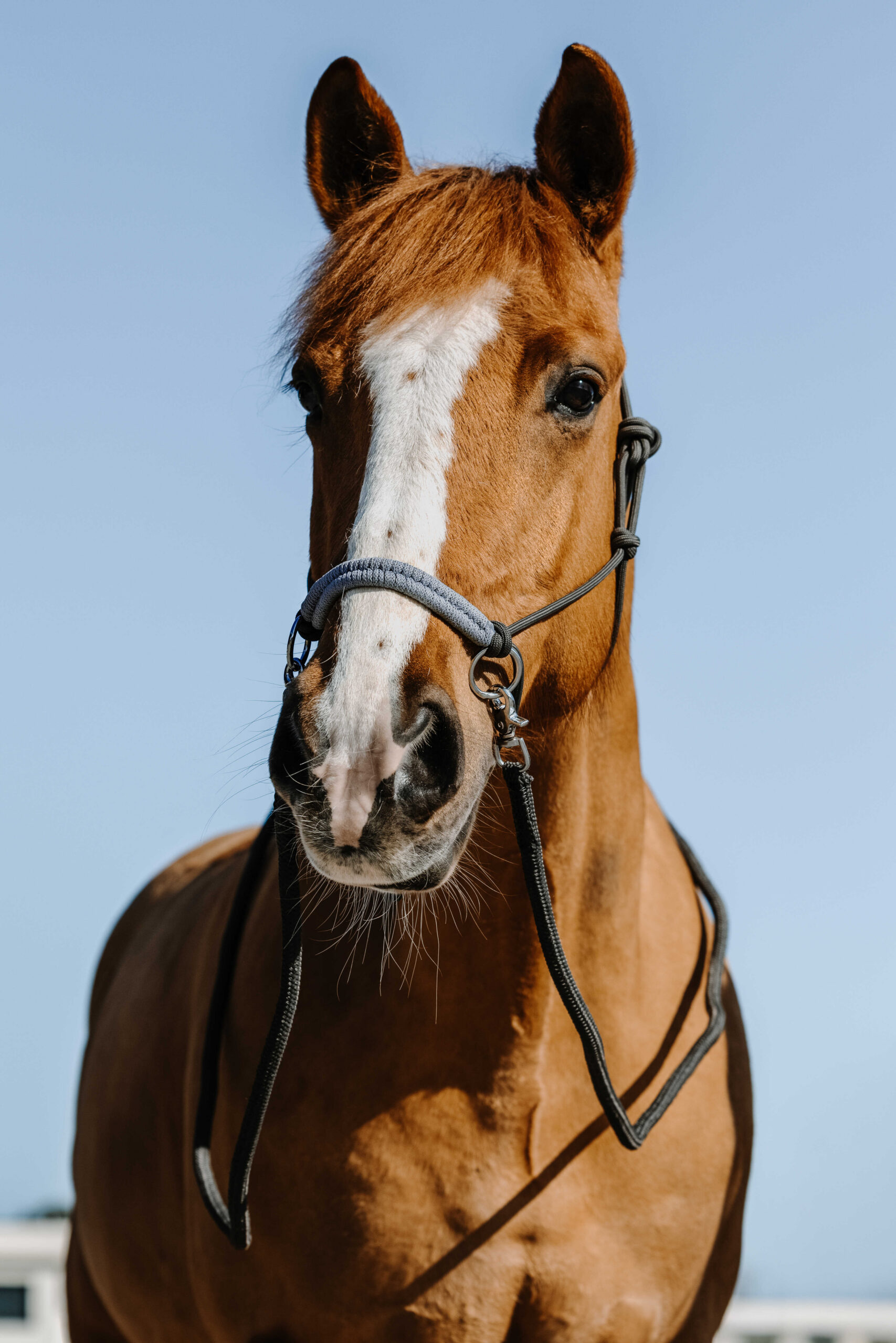 – 6.5mm polypropylene rope halter equipped with 2 chrome-plated steel rings on the noseband to attach the reins.