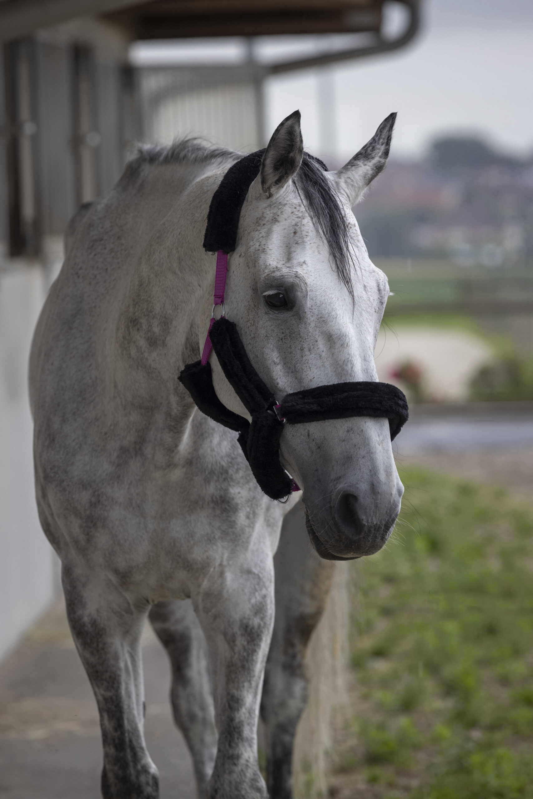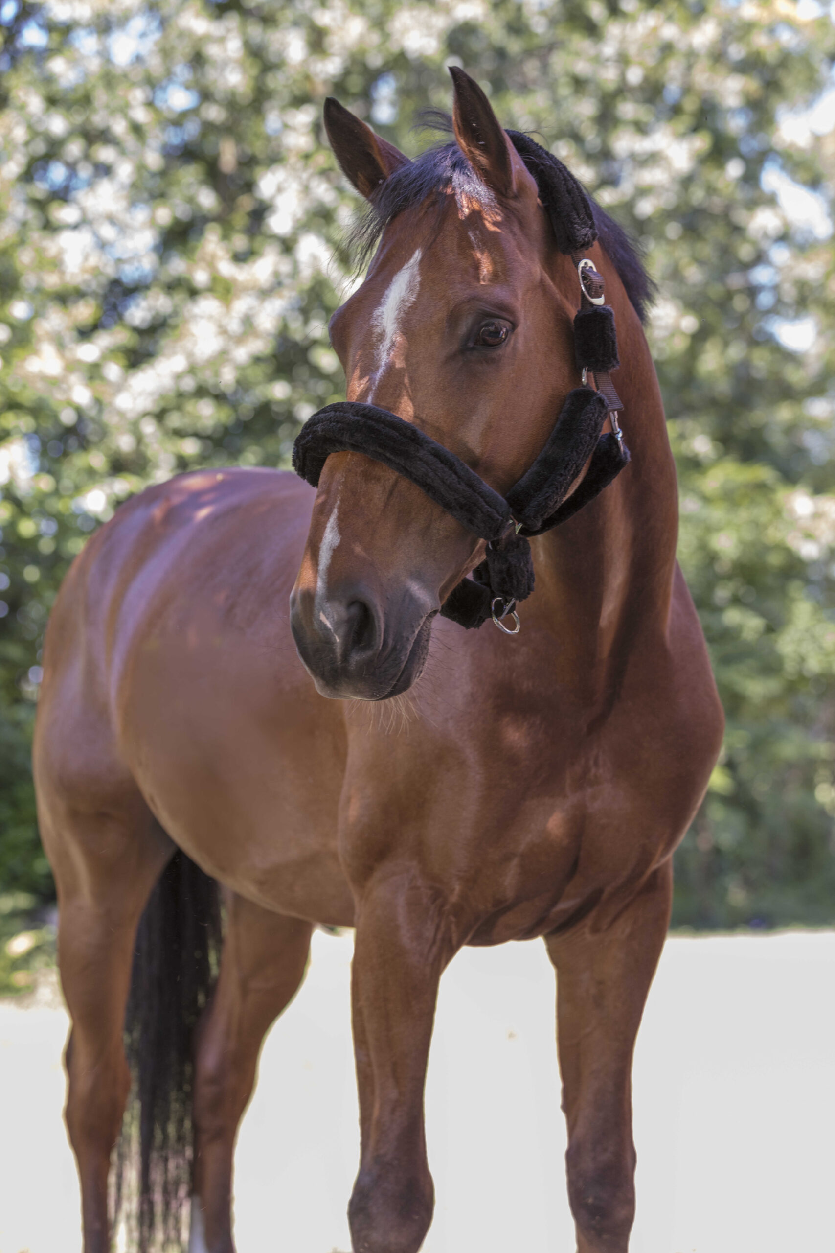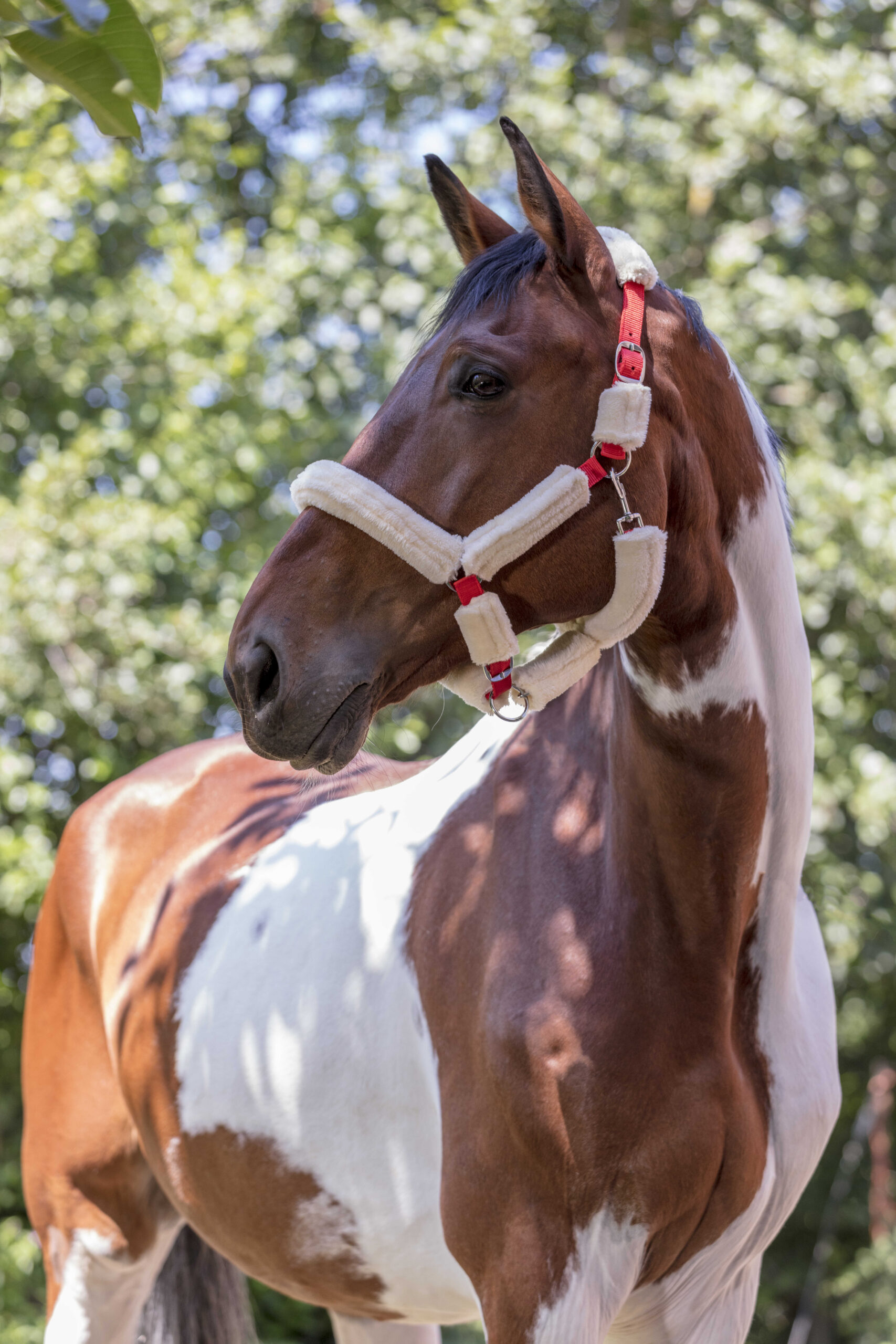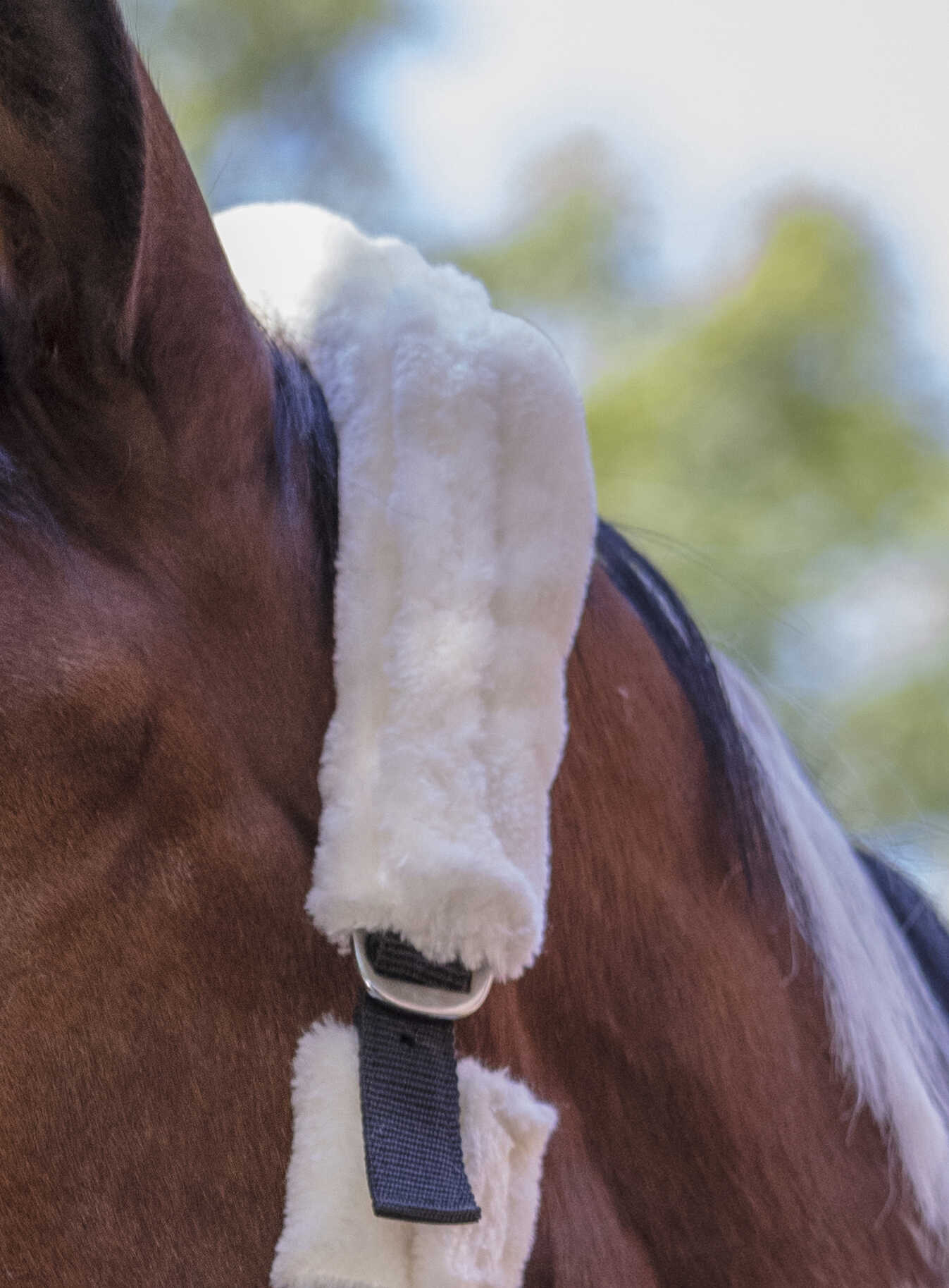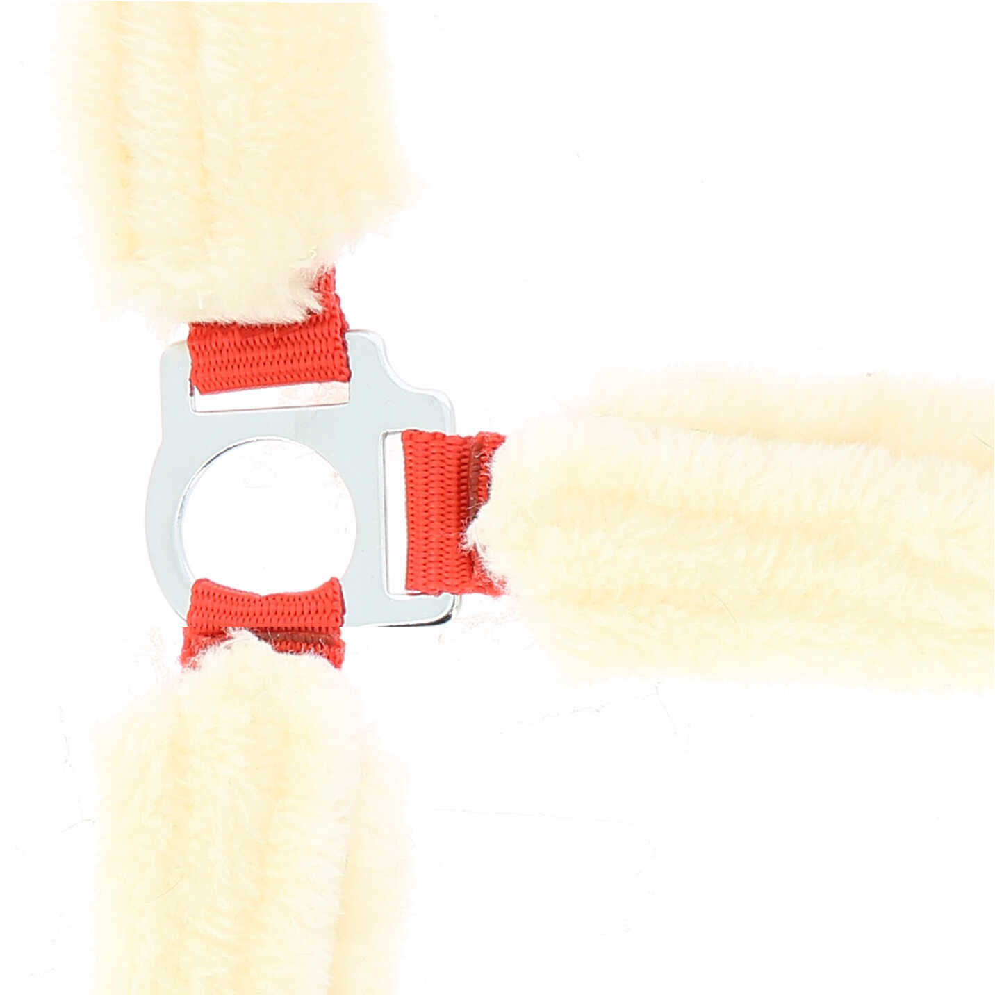 Made of polypropylene with adjustment buckle and carabiner, fully covered in synthetic sheepskin, detachable with Velcro strip.