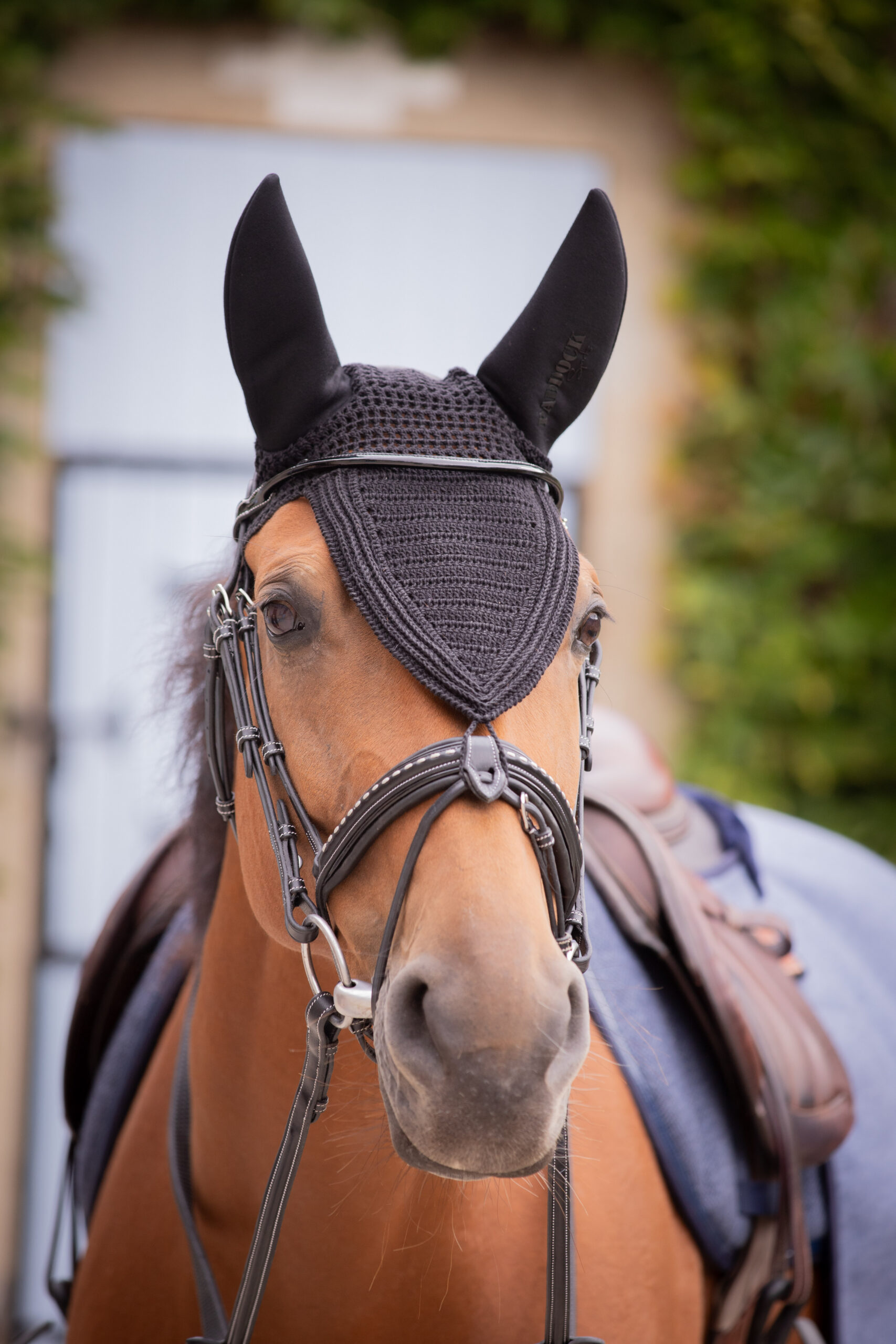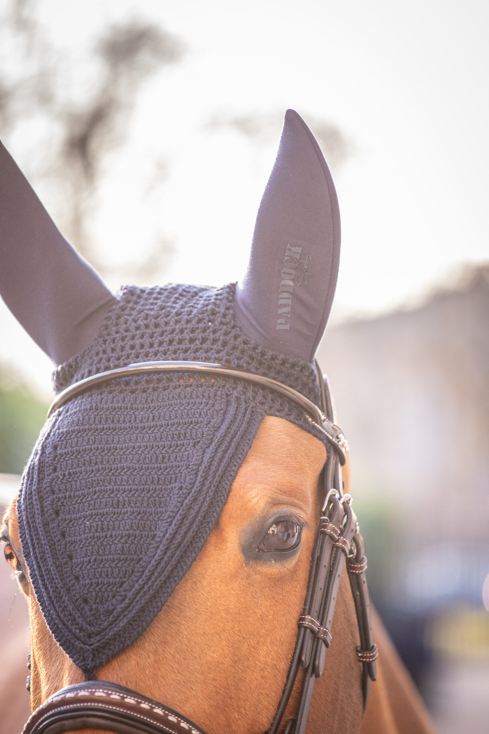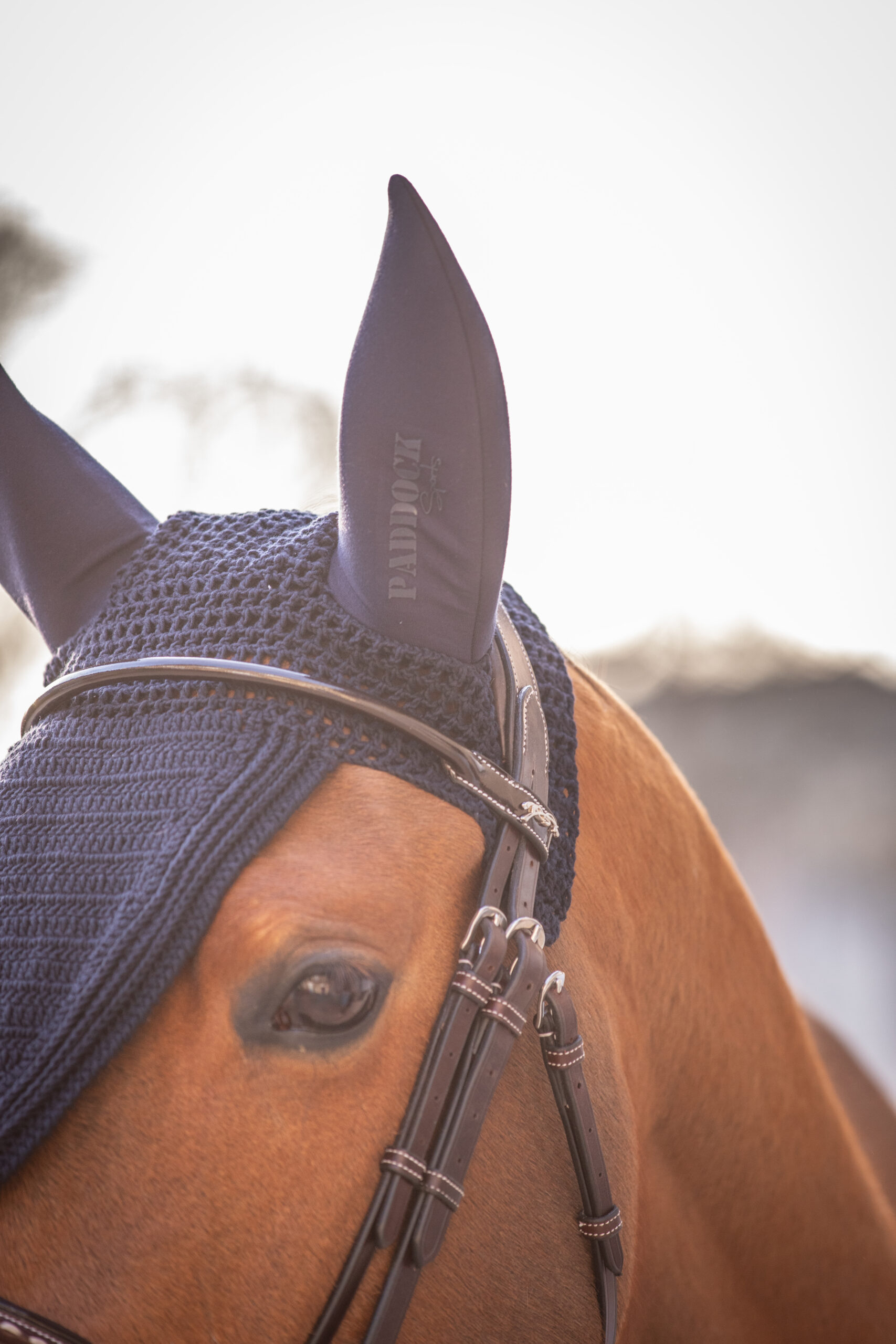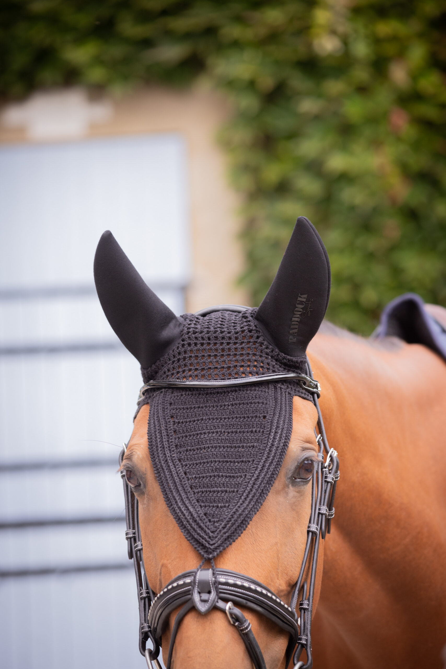 Soundless Long Pro Cotton Bonnet Paddock. Made from a fairly dense fabric, this bonnet fits perfectly on the horse’s head. The ears feature soft inserts that protect the horse from insects, noise, and the elements, thus promoting concentration. The left ear features a discreet and elegant rubber Paddock Sports logo. It features a small fastener at the bottom of the V that easily attaches to the noseband. Composition: Knit: 100% Cotton; Ears: 90% Viscose, 10% Elastane; Available colors: black and navy; Available Sizes: full or cob; Care instructions: Machine wash at 30ยฐC – Do not tumble dry; allow to air dry.