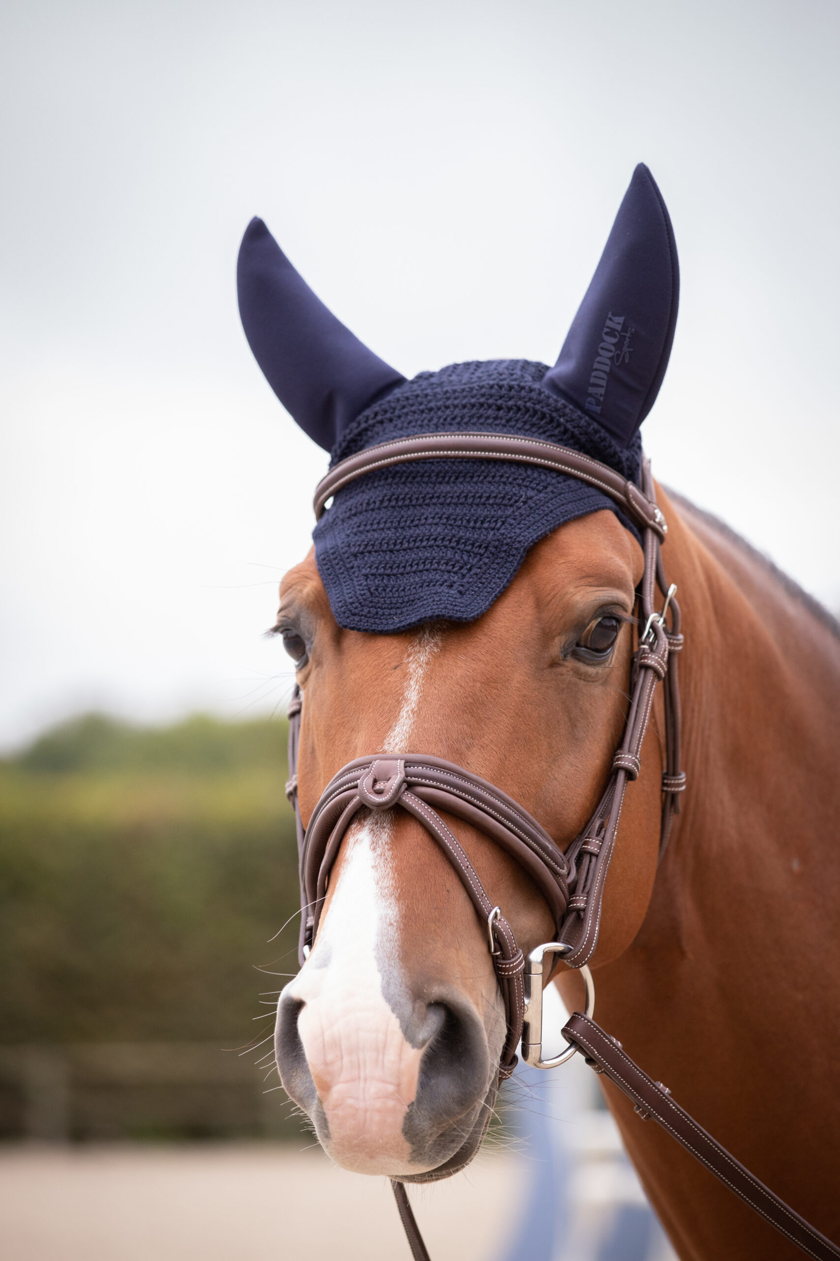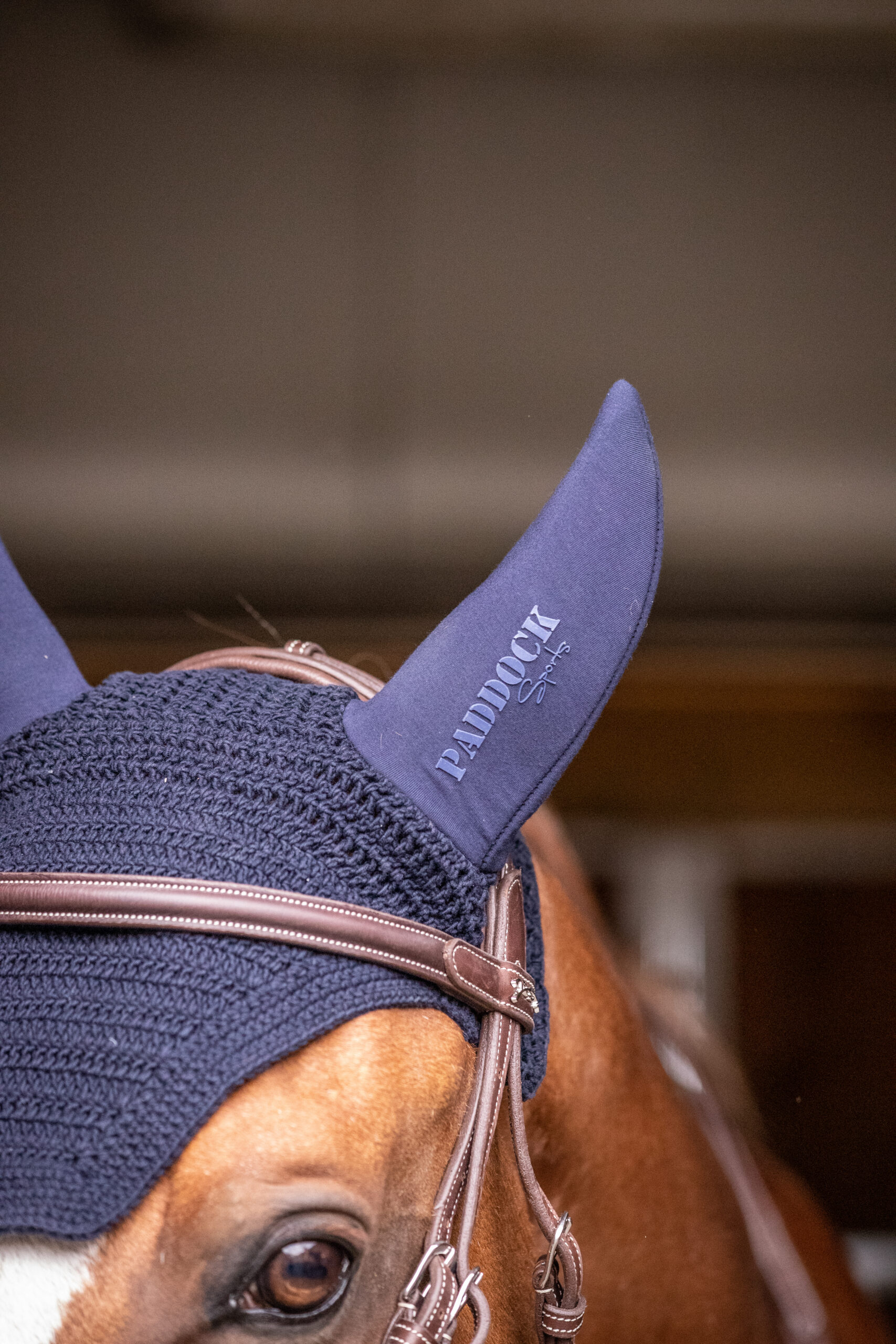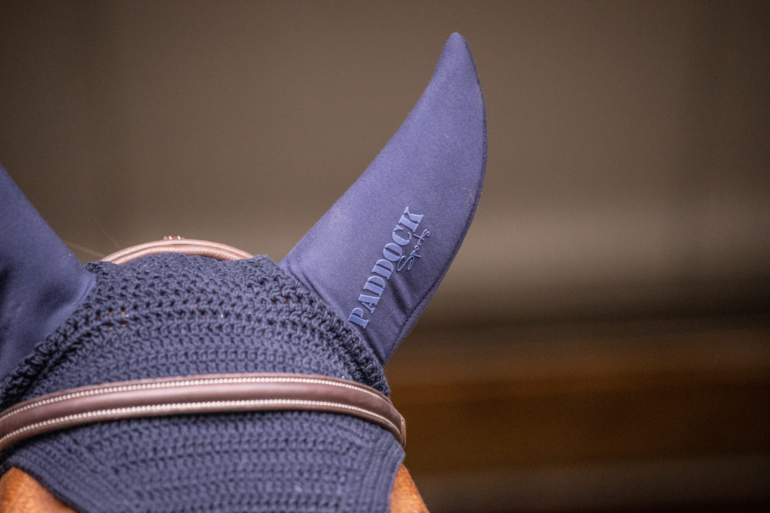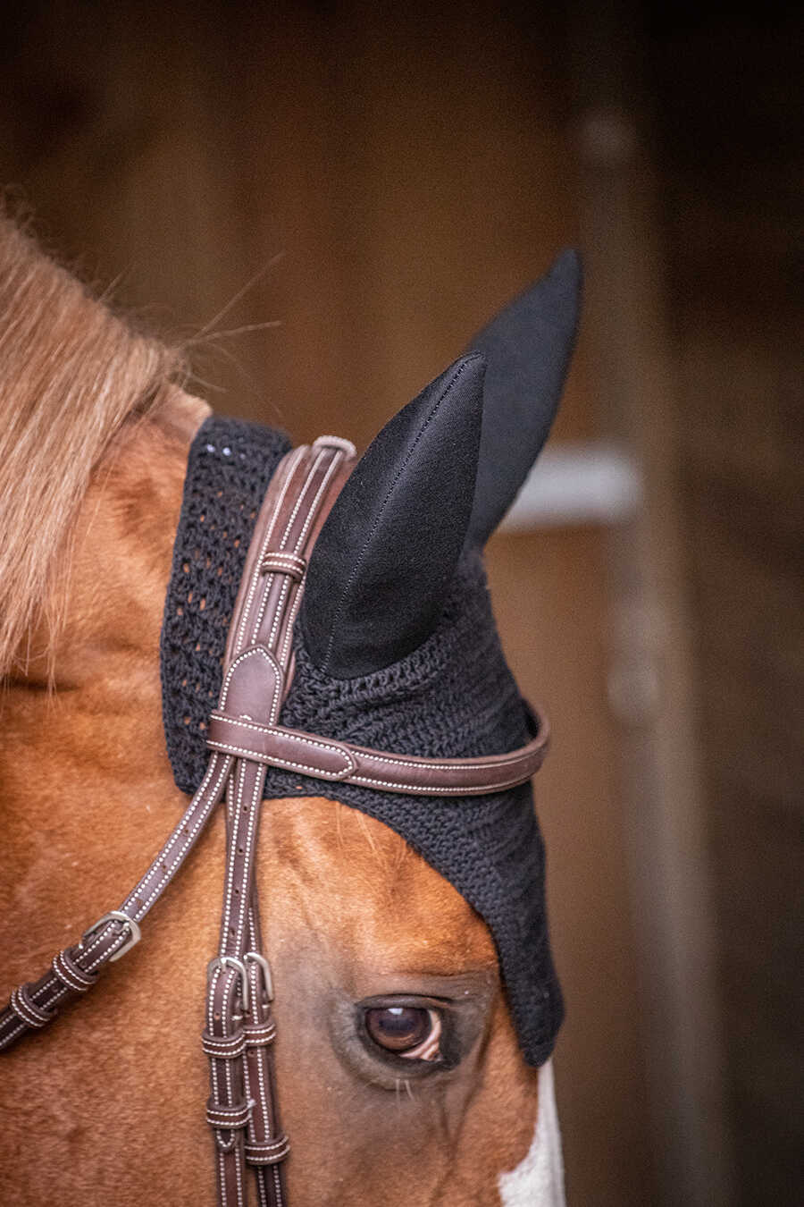 Soundless cotton hat available in horse Size. This high-quality hat is crocheted with a fairly thick yarn and fits perfectly to the horse’s head. It features lined ears that protect against outside noise and promote the horse’s concentration. It also protects against insects and weather influences for horses sensitive to these types of influences. Material: 100% polyester. Available in navy or black. Only available in horse Size.