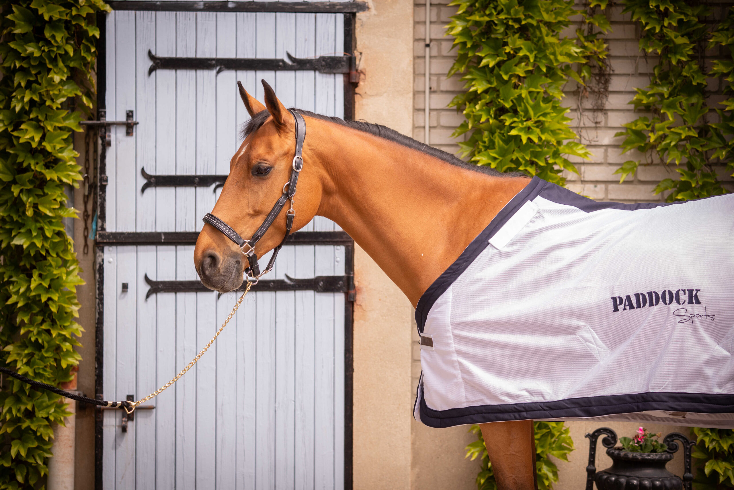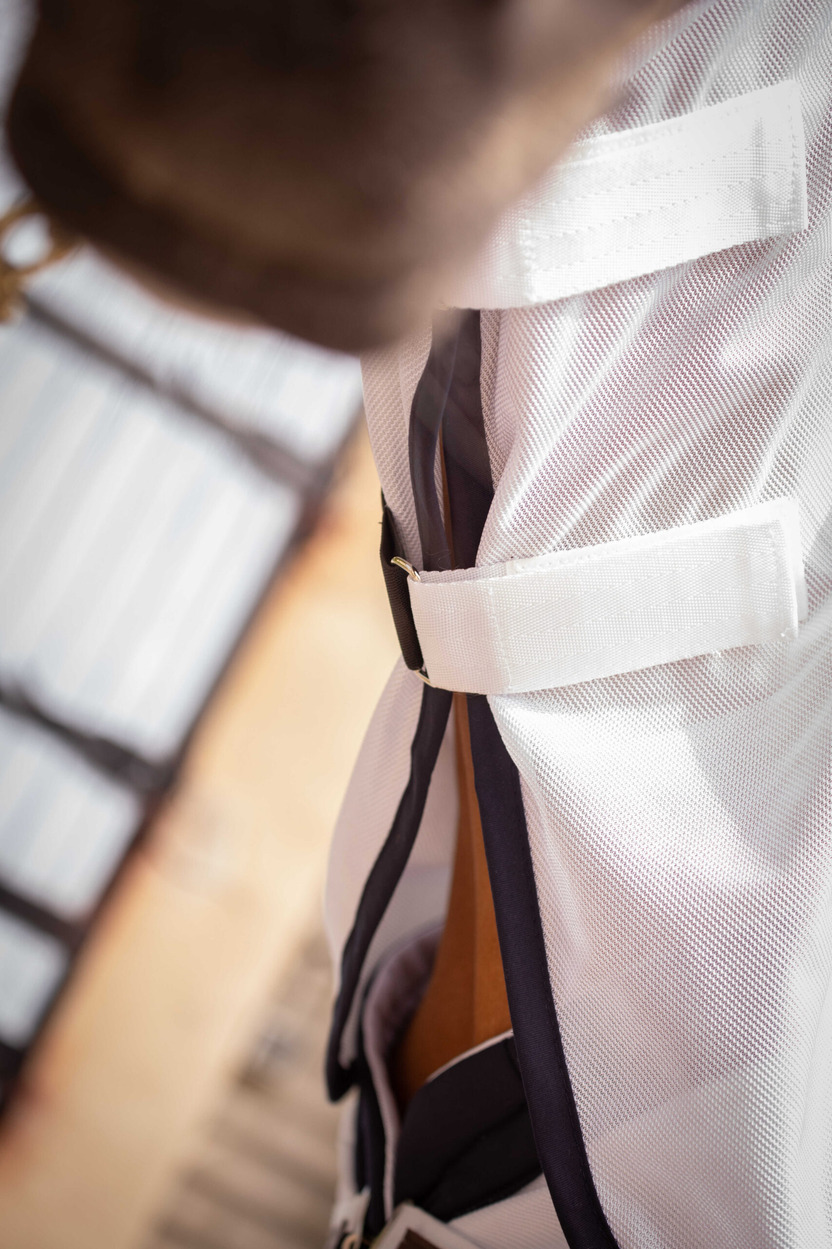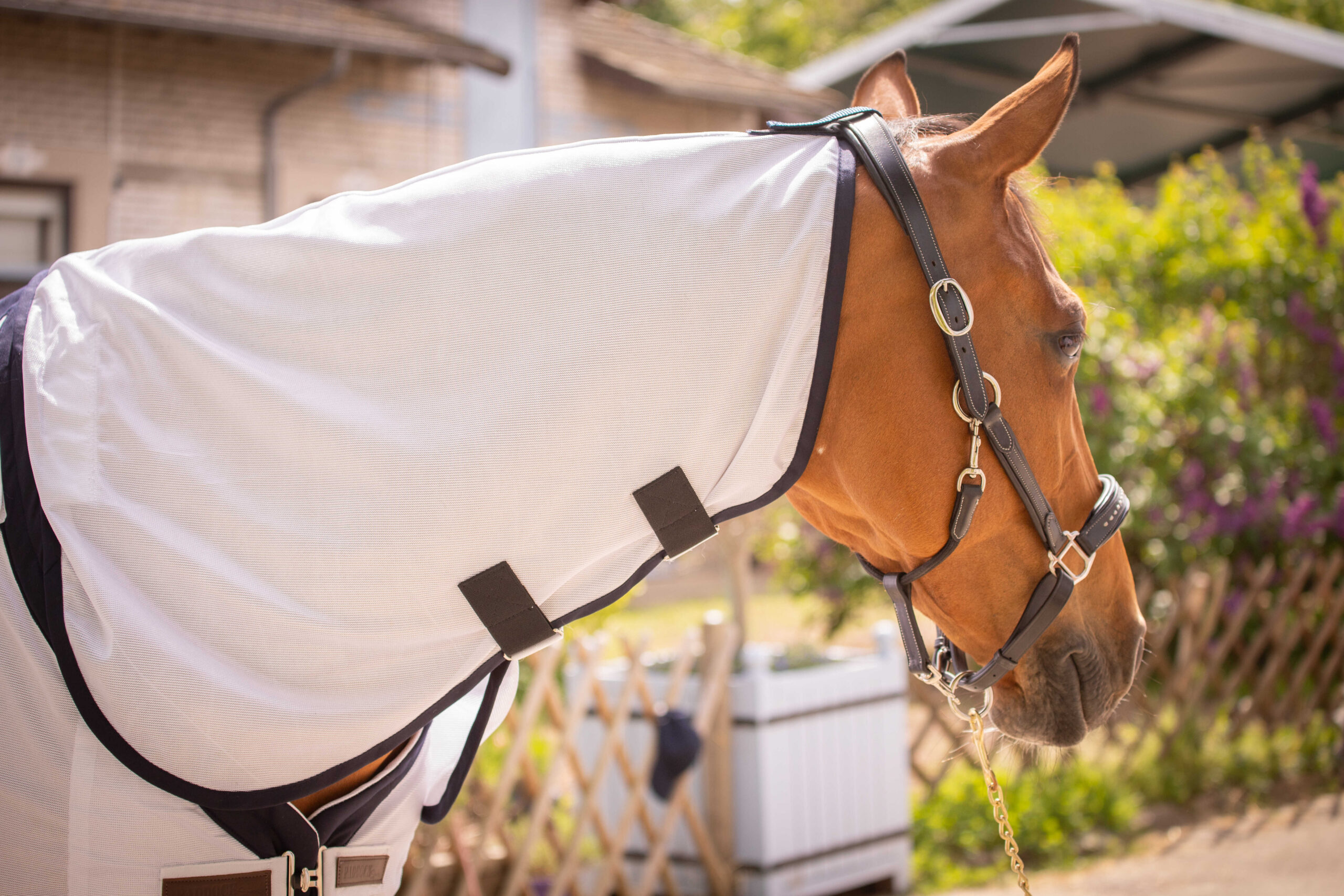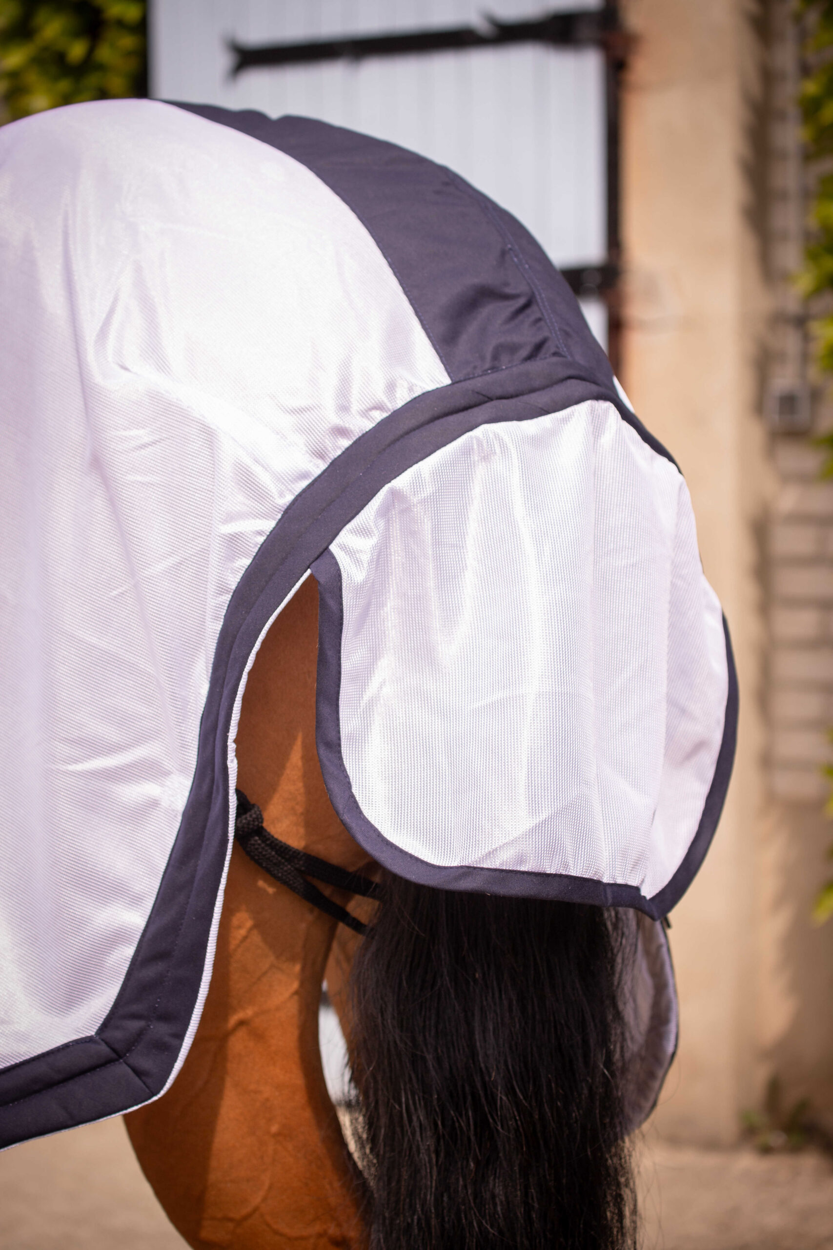 The UV Mesh Combo Paddock Shirt is designed to protect horses from the sun’s rays and insects. The white fabric it’s made of is very durable, and its fine mesh acts as a reliable barrier against most insects. Unlined, it’s very lightweight and can be worn in hot weather. It features a chest closure, two belly straps, and a tail flap. It can be worn alone or with a removable neck protector for complete protection. Its ergonomic cut fits the horse’s body perfectly and stays in place, and a small sporty notch is visible at the back. As always with Paddock, the shirt combines technical design with a very chic look thanks to the addition of a beautiful and wide navy blue outer trim. Composition: 100% polyester and 100% stainless steel fittings. Size guide: This product fits perfectly; you can choose your horse’s usual Size. Care instructions: The UV Paddock Shirt is perfectly machine washable. Be sure to tie the fasteners together to avoid damaging your washing machine’s drum. No dryer; you can let it air dry.